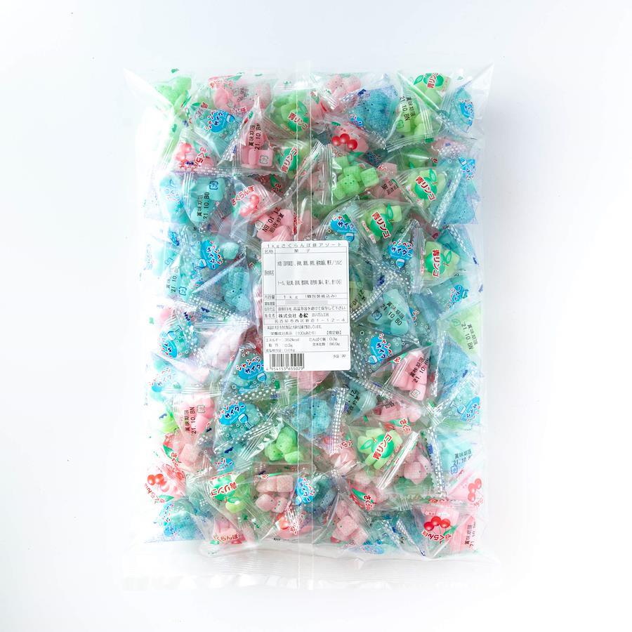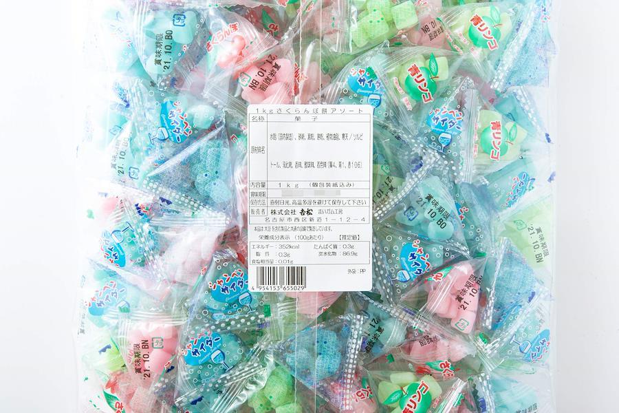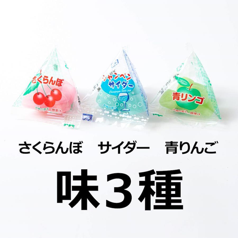 【味は3種類】さくらんぼ、サイダー、青りんご、の3種類アソートです。どれを食べようか迷ってしまいますね!たくさん入っているのでみんなでシェアもできます。