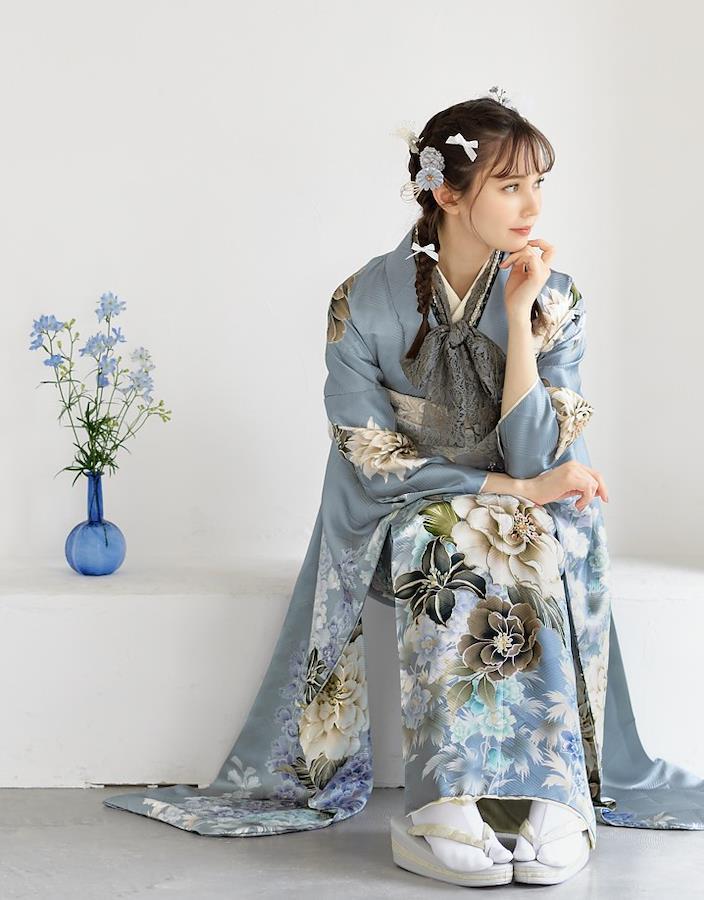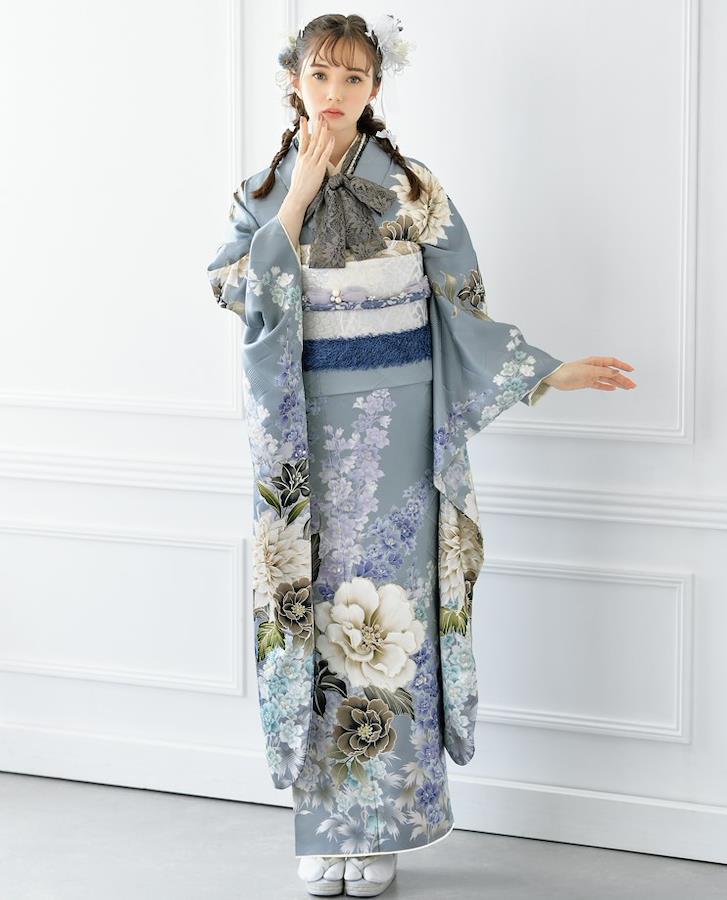 NABESHIMAオリジナル振袖、「furisode Coffret」CF-501。受注生産になりますので、生産に約3か月、仕立てに2か月、合計最長で5か月程度を見込みます。なお、仕立てに関しましては、特にご指定のない場合、裄70㎝でお仕立てさせていただきます。胴裏はポリエステルです。1点あたりの重量:約1KG ※商品は振袖のみです※お返事は土日祝日除く平日の営業日5日間程度頂戴します