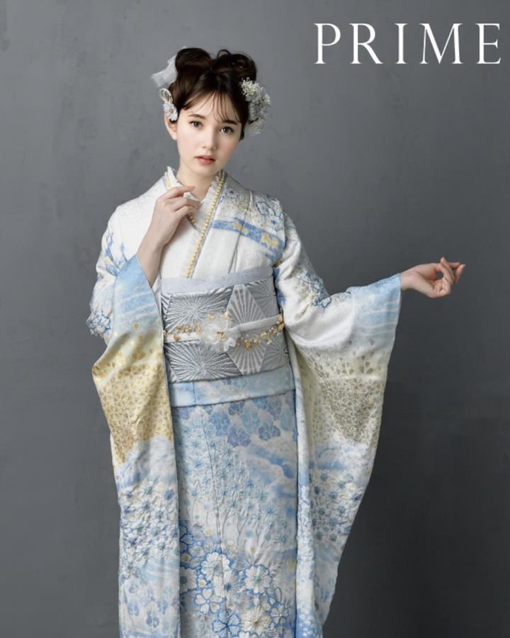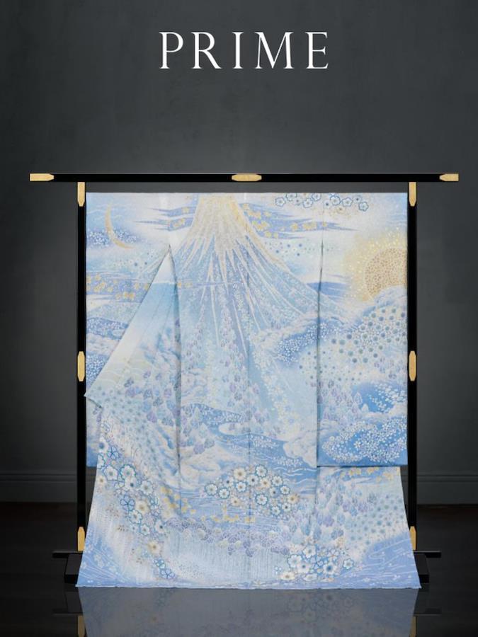 NABESHIMAオリジナル振袖、「PRIME」PR-22 京友禅競技大会受賞柄。富士山に月と太陽を配した柄の振袖です。受注生産になりますので、生産に約3か月、仕立てに2か月、合計最長で5か月程度を見込みます。なお、仕立てに関しましては、特にご指定のない場合、裄70㎝でお仕立てさせていただきます。胴裏はポリエステルです。1点あたりの重量:約1KG