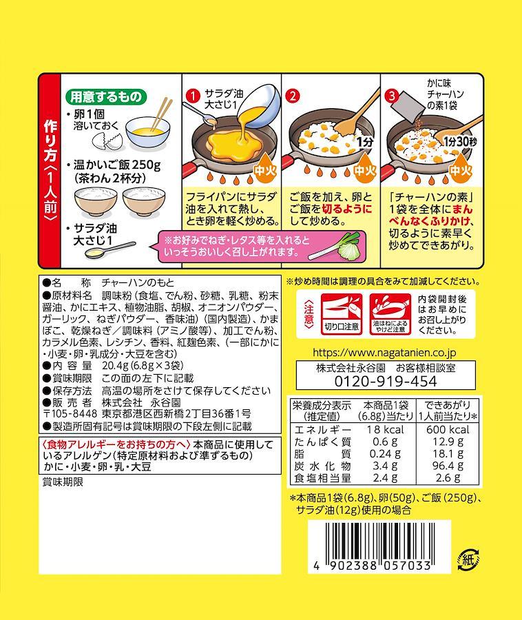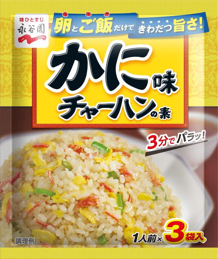 かに風味かまぼこ、ねぎの具が入った粉末タイプのチャーハンの素です。卵とご飯を用意して、フライパンで3分炒めるだけで、簡単にパラッとしたおいしいチャーハンが、できあがります。かに香味油で、かにの風味が際立つ味わいに仕上げました。永谷園のロングセラー商品です。