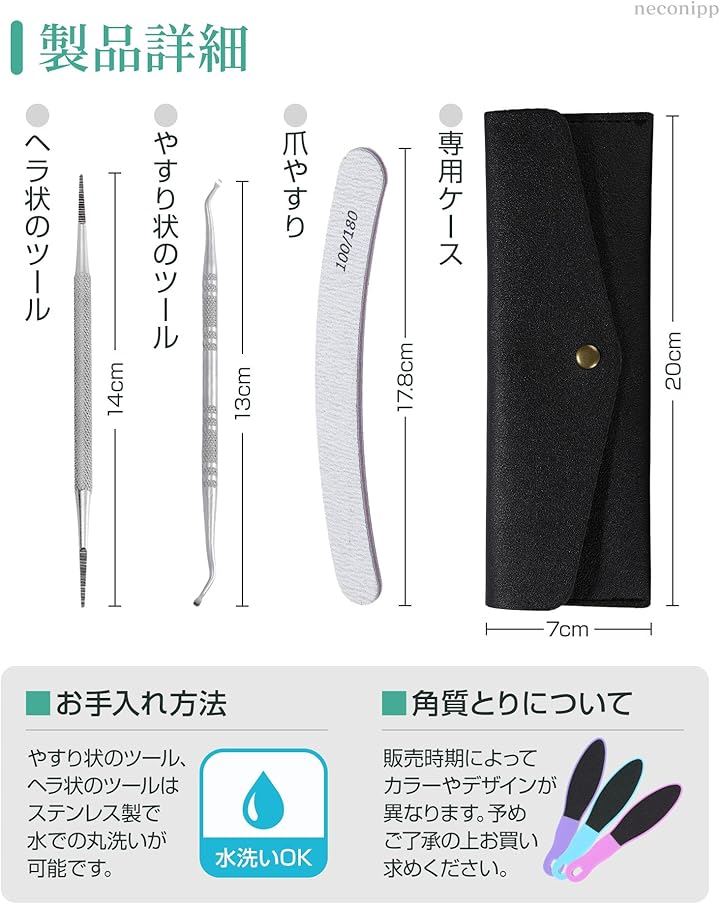 セット内容:ステンレス製ツール2種、爪やすり1本、かかとの角質取り1本、説明書、ケース