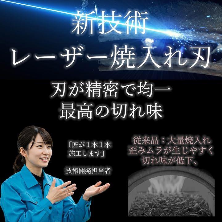 一方、レーザー焼き入れは最新の技術で刃先を硬くし、長持ちする鋭さを実現します。