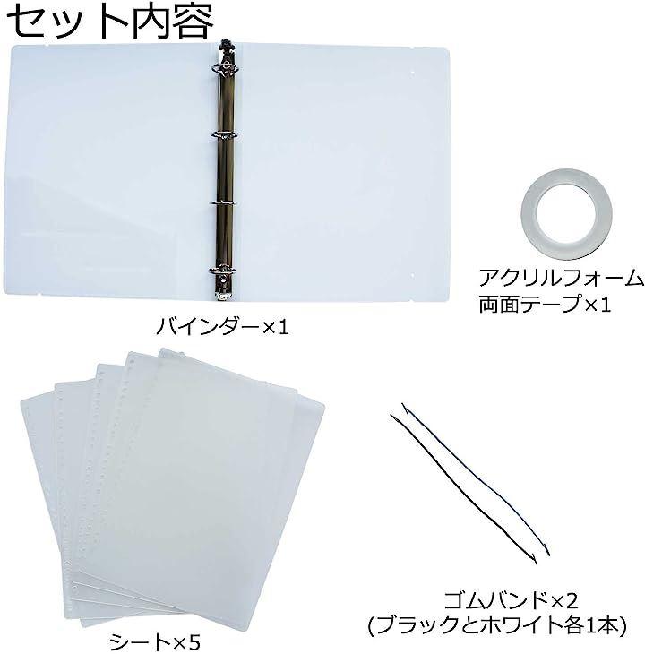 セット内容はバインダーx1、シートx5、ゴムバンドx2、アクリルフォーム両面テープx1になります。