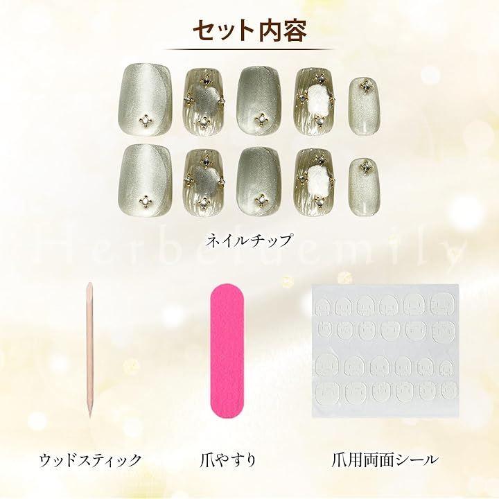 「商品仕様」専用クリアケース:7.5x7.5x1.6cm ネイルチップ10枚 付属品:両面シール、ウッドスティック、爪やすり *ネイルチップサイズの詳細は商品画像をご確認ください。