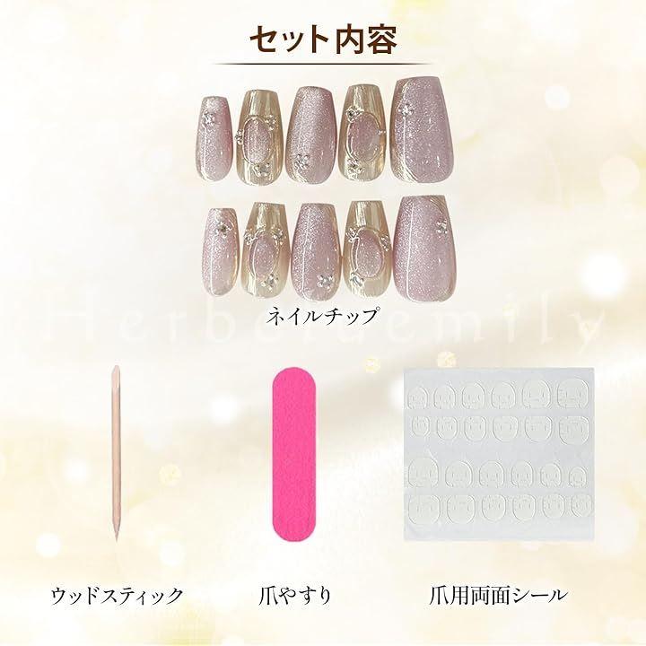 ネイルチップのセットには、両面接着シール、爪ヤスリ、ウッドスティックが付属しており、自宅で簡単に取り付けや取り外しができます。