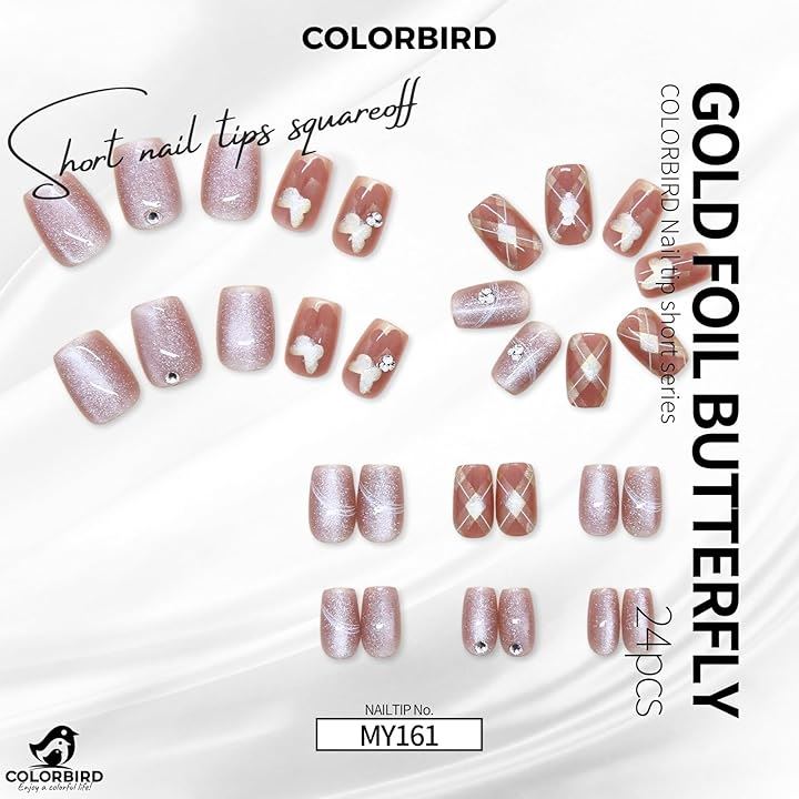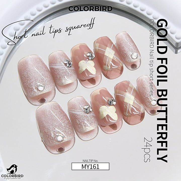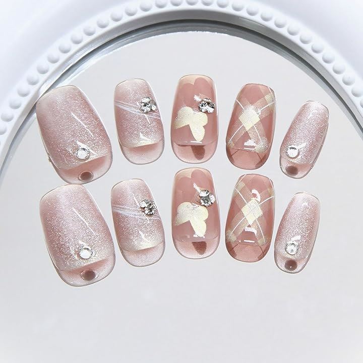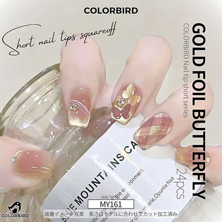 シャンパンベージュのグリッターが指先に上品な輝きを添え、チェック柄やゴールドのチョウがエレガントなアクセントをプラス。
