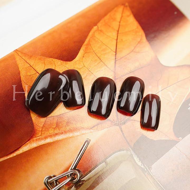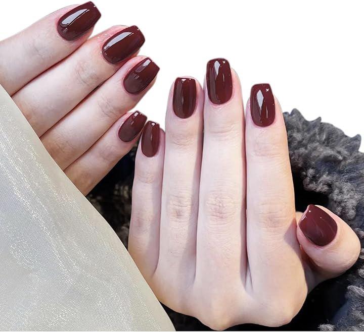 「トレンドのブラウン味がかったレッド(赤)ネイル」ボルドーが大人っぽい印象の艶がきれいなネイルチップ。