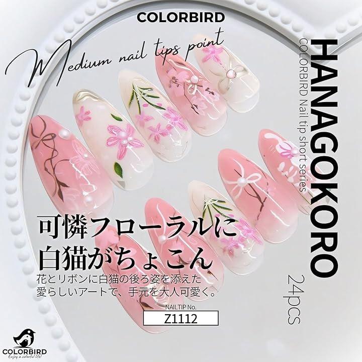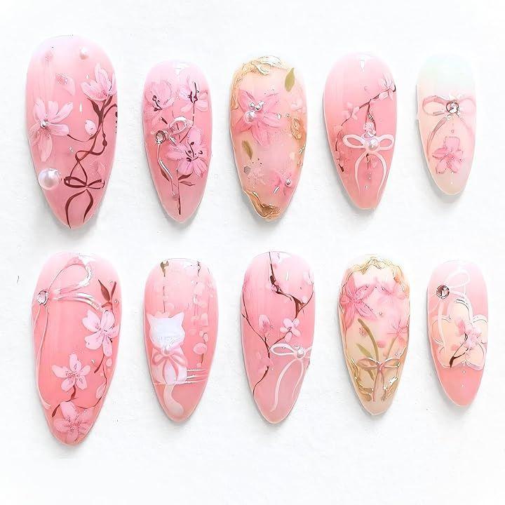 可憐な花柄、愛らしい白猫の後ろ姿、そしてエレガントなリボンデザインを組み合わせたミディアムポイント型ネイルチップ。