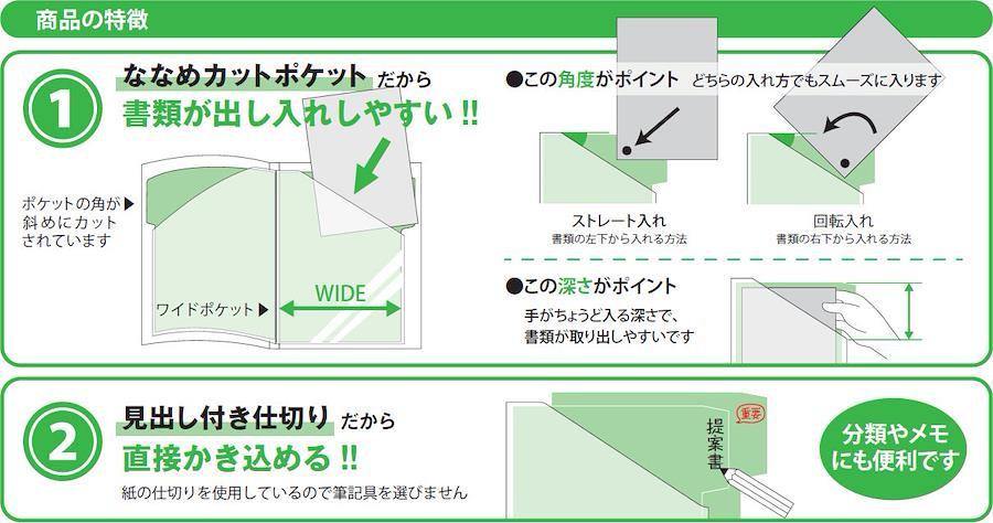 ななめカットポケット、見出し付き中紙で書類が出し入れしやすいクリアブックです