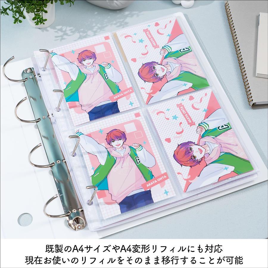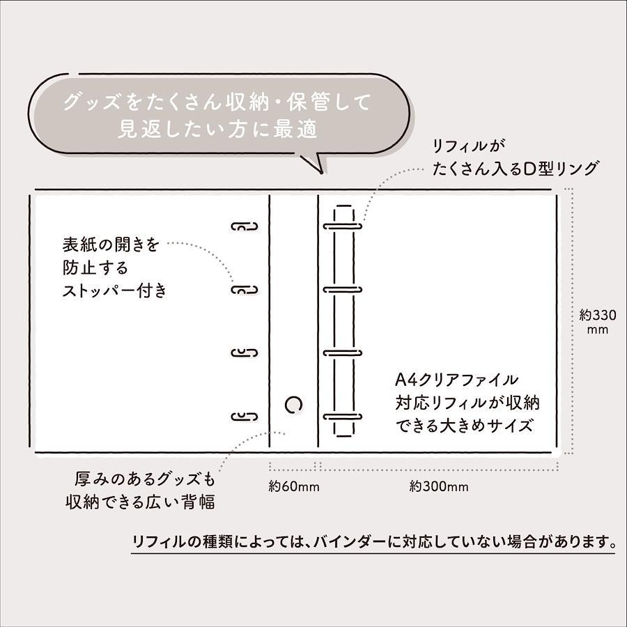 物をしっかり収納するために設計された、形状、構造、色にこだわりを持つ収納用バインダーです。たくさんのグッズを収納しても安定感を保つために、表紙には四箇所のストッパーを採用。さらに、見返しやすさと大容量収納を実現するために、大きなD型4穴金具を採用し、背幅約60mmの広いスペースで、多くのリフィルを収納できます。