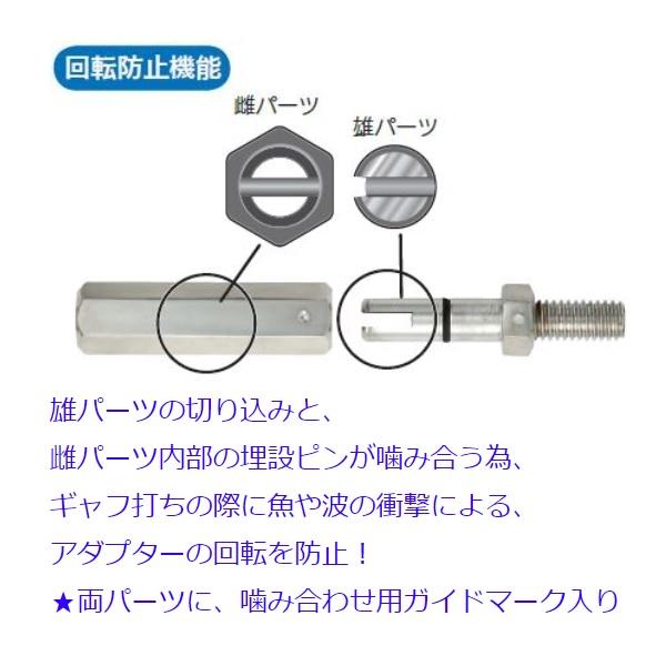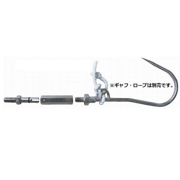 フライングギャフシステム専用アダプター。タモの柄に負担をかけず、安全に大物を取り込める4分ネジ専用フライングギャフアダプターです。 サイズ:線径Φ19×105mm 重量:170g ネジ径:4分 入数:1 材質:ステンレス、カーボンゴム ※実物と色が違って見える場合があります。あらかじめご了承下さい。