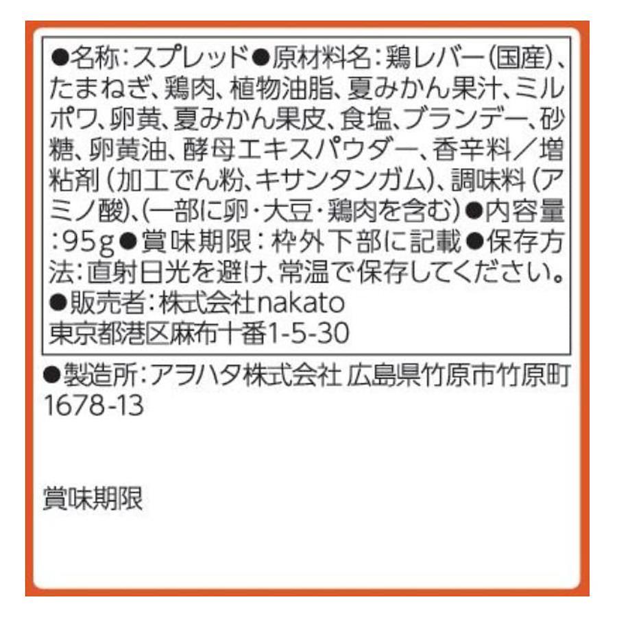 ?鶏レバー(国産)、たまねぎ、鶏肉、植物油脂、夏みかん果汁、ミルポワ、卵黄、夏みかん果皮、食塩、ブランデー、砂糖、卵黄油、酵母エキスパウダー、香辛料/増粘剤(加工でん粉、キサンタンガム)、調味料(アミノ酸)、(一部に卵・大豆・鶏肉を含む)