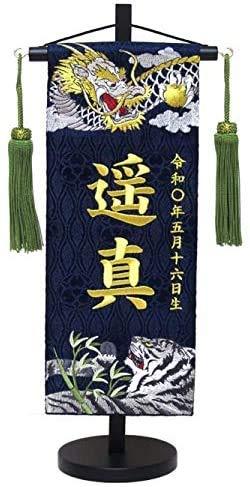 名前旗 名入れ代込み 名前旗 No.MR1527-5-1 紺(小)金糸 龍虎の刺繍をあしらった名前旗です。五月人形のとなりにお飾りいただくと最適です。 お子さまのお名前と生年月日を刺繍でお入れてお届けいたします。お名前入れ代は料金に含まれております。※カートに入れた後「ギフトの設定」にチェックをいれ「ギフトメッセージ」欄にお子様のお名前と生年月日をご記載ください。 ※または、ご注文の際にお子様のお名前と生年月日をお問い合わせ欄にご記入ください。 ※お名前入れには2日から8日程度のお時間をいただいております。 サイズ:高さ40(cm)台付 旗サイズ13×30㎝