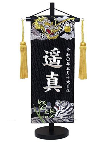 名前旗 名入れ代込み MR1527-4-1黒小 龍虎 龍虎の刺繍をあしらった名前旗です。五月人形のとなりにお飾りいただくと最適です。 お子さまのお名前と生年月日を銀糸刺繍(金糸でも可能)でお入れしてお届けいたします。お名前入れ代は料金に含まれております。※カートに入れた後「ギフトの設定」にチェックをいれ「ギフトメッセージ」欄にお子様のお名前と生年月日をご記載ください。 ※または、ご注文の際にお子様のお名前と生年月日をお問い合わせ欄にご記入ください。 ○※お名前入れには2日から5日程度のお時間をいただいております。 サイズ:高さ40(cm)台付 旗サイズ13×30㎝
