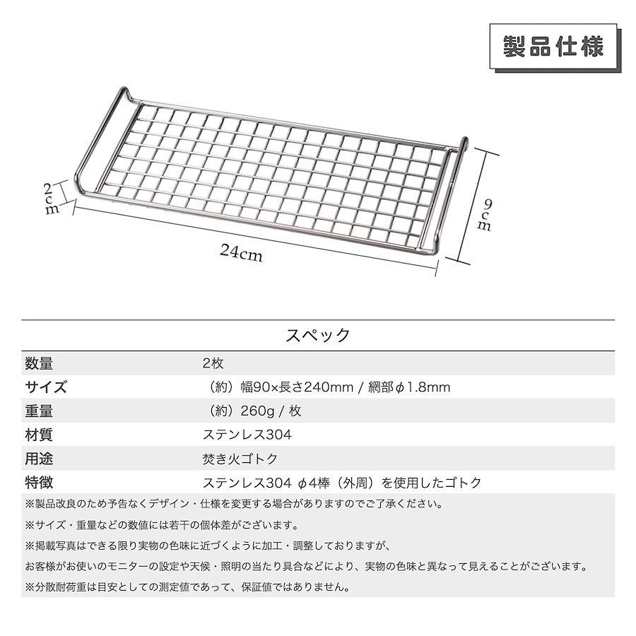 材質:ステンレス304 φ4丸棒サイズ:(約)幅90×長さ240mm / 網部φ1.8mm重量:(約)130g / 枚特徴:ステンレス304 φ4棒(外周)を使用したゴトク用途:軽量焚き火台用ゴトク
