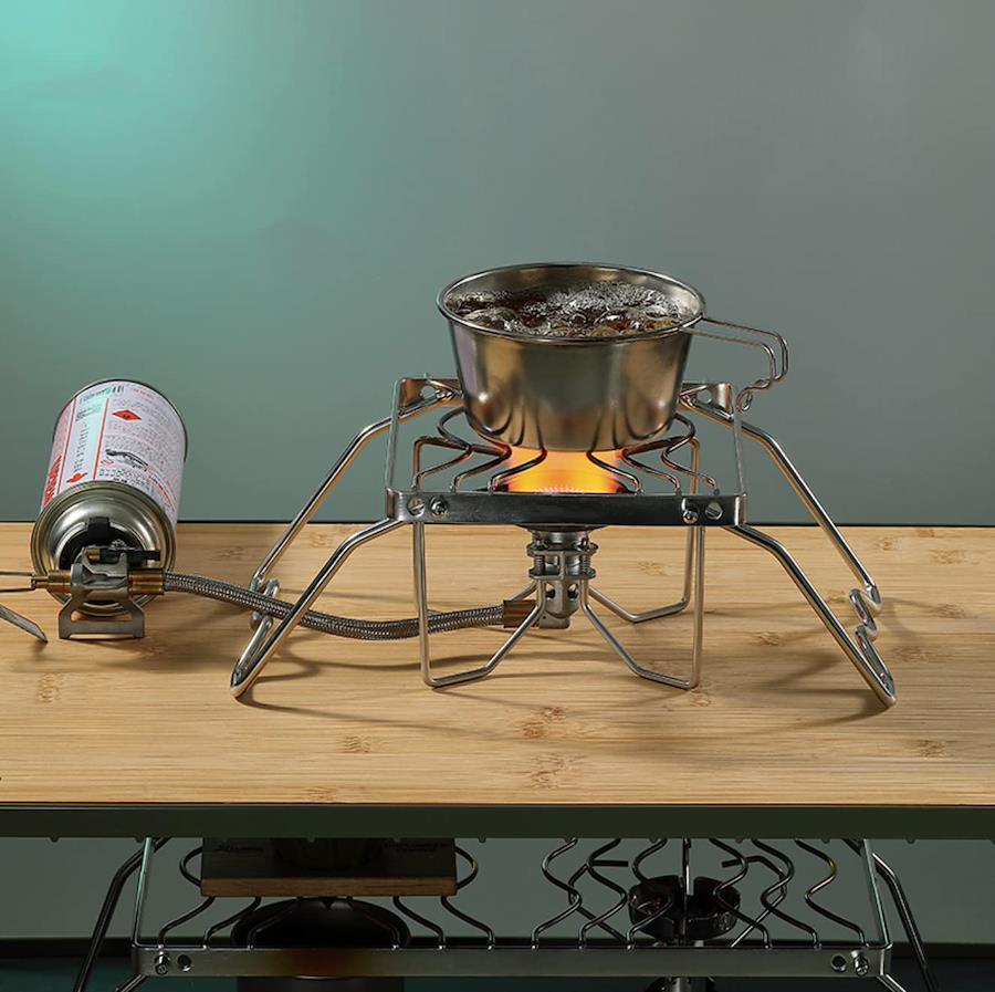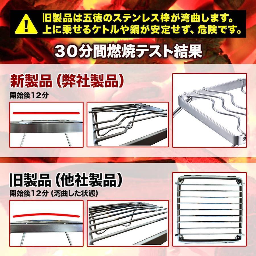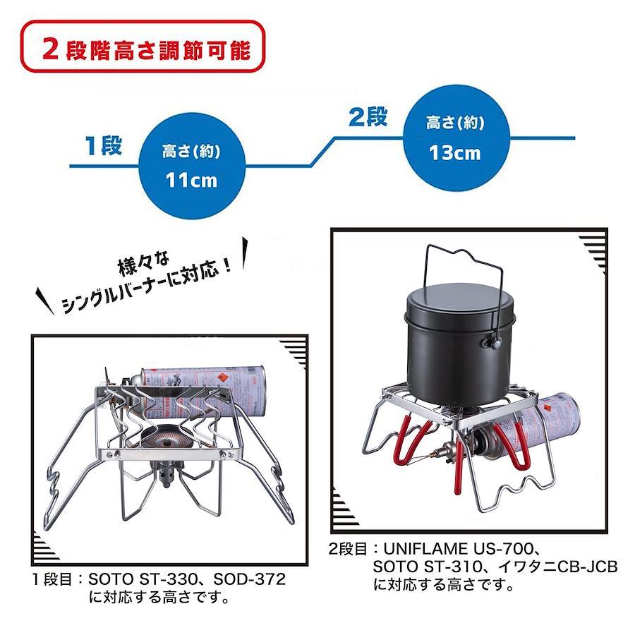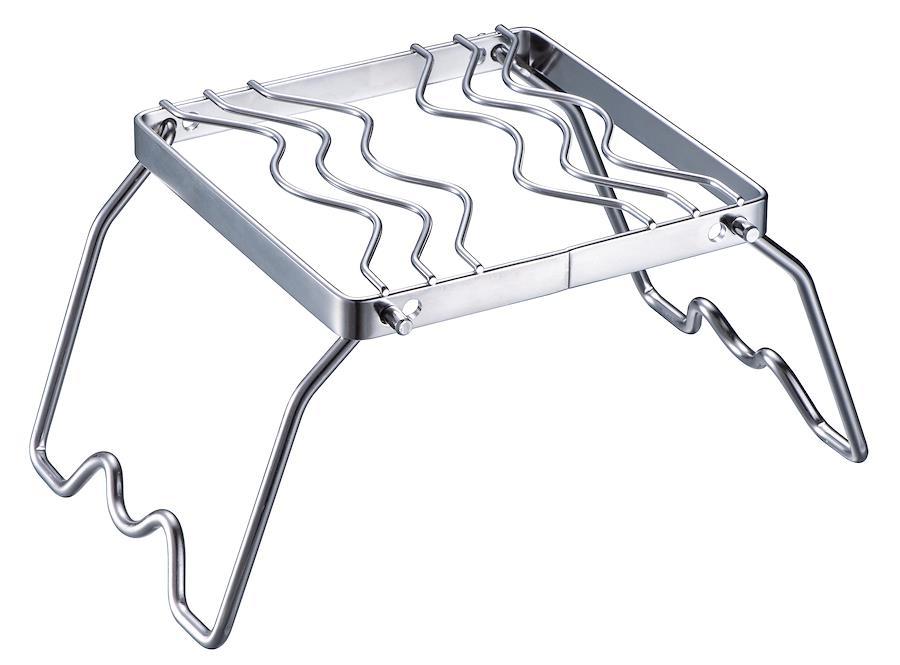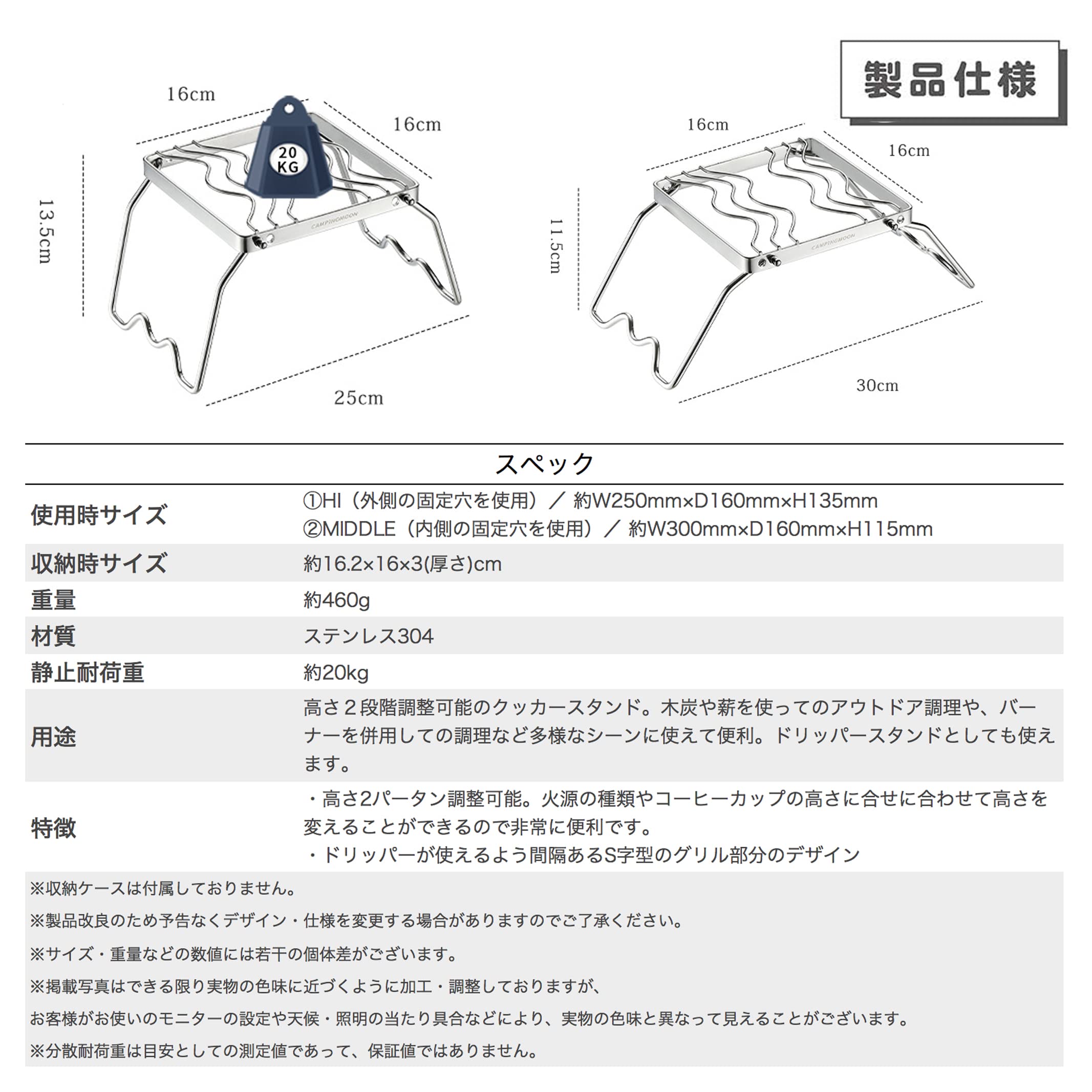 アウトドア料理に便利なグリルスタンド。ダッチオーブンのスタンドとして、シングルバーナーの五徳として、飯盒焚き、フライパン料理、焚き火台など用途は多彩です。五徳の上に網を置いて食材を焼くこともできます。お陰様でお客様からは特に「SOTO ST-310」との相性が抜群と好評です。もちろんその他のシングルバーナーにも対応しています。収納時は折りたたむことができますのでコンパクトに収納、持ち運びも楽々です。膨張熱による湾曲を防止するため、仕様変更を行いました。五徳の棒を「S」の字に曲げることで湾曲を防止します。永く安定的に安全にご使用いただけます。【サイズ】五徳部分:16cm×16cm; 高さ:11.5~13.5cm2段階調整; 収納時サイズ:約16.2×16×3(厚さ)cm【材質】SUS304【静止耐荷重】20kg【用途】高さ2段階調整可能のグリル スタンド。木炭や薪を使ってのアウトドア調理や、バーナーを併用しての調理など多様なシーンに使えて便利。ドリッパースタンドとしても使えます。※ロータイプの状態で脚を折り畳めません。脚を外してハイタイプに戻してからの収納になりますので、ご注意くださいませ