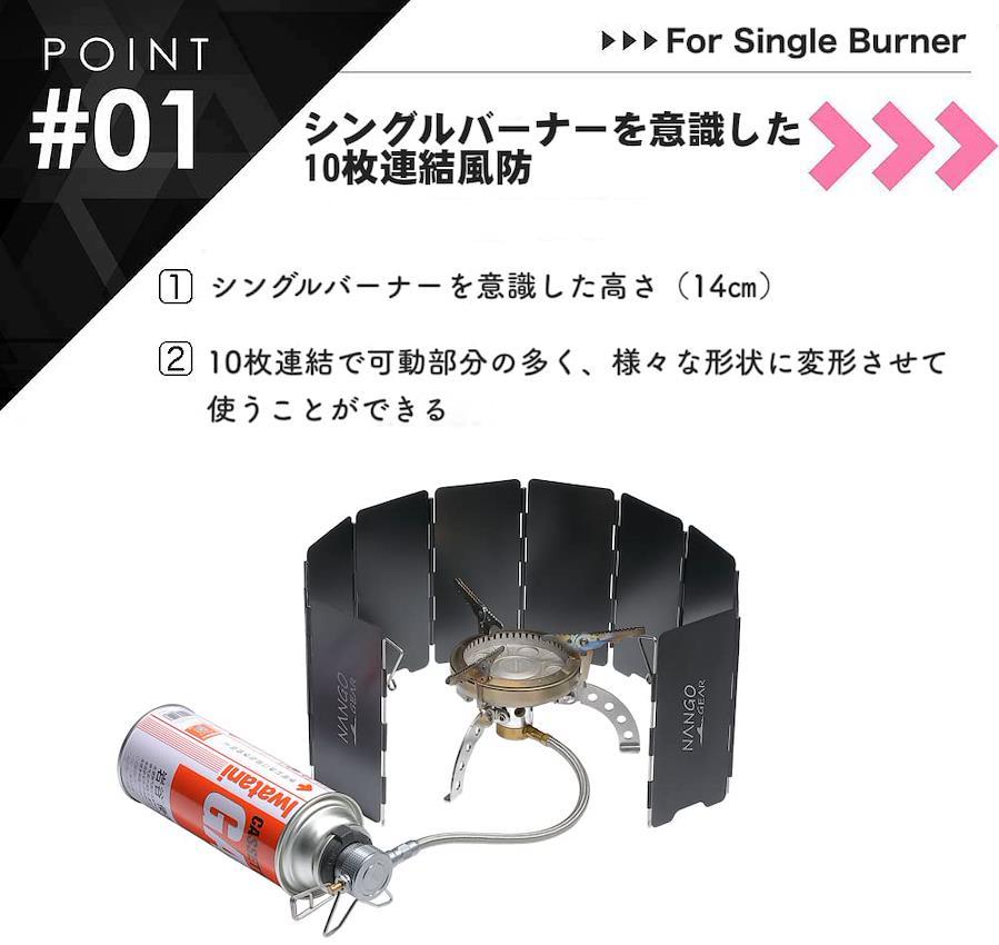 風防でガス部分を囲い込まない!! 軽量ウインドスクリーンをシングルバーナー で使用するにあたって、注意が必要なのはその配置です。 シングルバーナーを置き、その周りを囲うように軽量ワイドスクリーンを置くのが想定される使い方ですが、その際に完全に囲い込まないようにしなければいけません。 これはシングルバーナーの炎で熱くなった軽量ウインドスクリーンによって、ガス缶が熱せられて爆発する危険があるからです。 シングルバーナーを並べて使ったり、大きい鉄板を乗せて使ったりすることが禁止されているのと同じ理由です。 軽量ウインドスクリーンは一番端に、地面に突き刺すための金具(ストッパーパン)があるので、それを押し込むことでガス缶を囲ってしまうのを避けることができます。 ウインドスクリーンは風で動いてしまうことがあるため、使用の際は必ず固定して使用するようにしましょう。 -