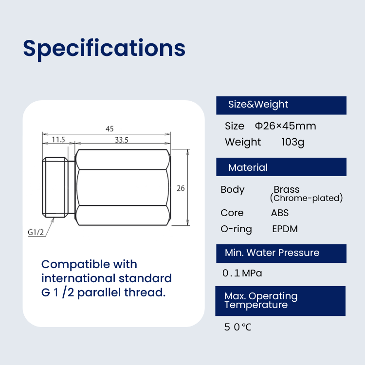 【Specifications】•Brand: NANORISM®•Manufacturer: Takanou Shoten•Model: TKN-259 (JAN: 4580788530259)•Inlet/Outlet Size: G1/2 (Parallel Thread)•Dimensions: 26φ × 45mm•Weight: 103g (Net) / 146g (Including Packaging)•Materials: POM (Body), ABS (Core), EPDM (O-ring), SUS304 (Retainer)•Max Temperature: 60°C (140°F)