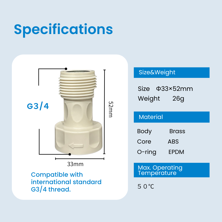 【Specifications】•Brand: NANORISM®•Manufacturer: Takanou Shoten•Model: TKN-266 (JAN: 4580788530266)•Inlet/Outlet Size: G3/4 (Standard Laundry Connection)•Dimensions: 33φ × 52mm•Weight: 26g (Net)•Materials: POM (Body), ABS (Core), EPDM (O-ring), SUS304 (Retainer)•Max Temperature: 50°C (122°F)