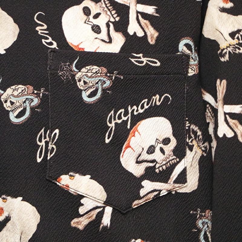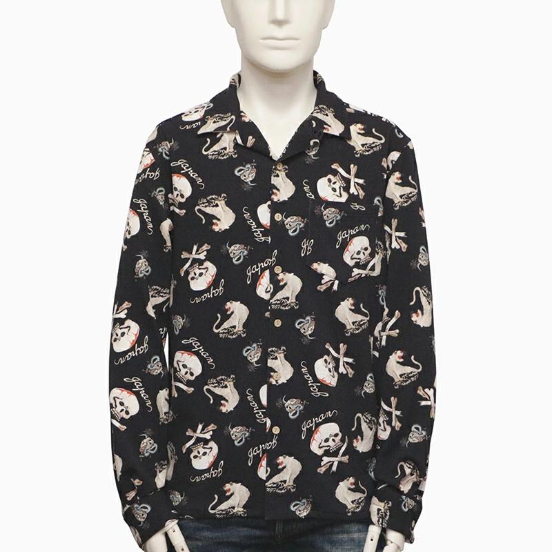 ストレッチ素材生地を使用した総柄 ヴィンテージスカルの長袖シャツ