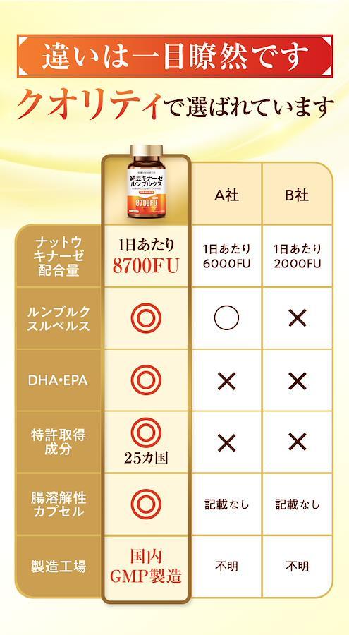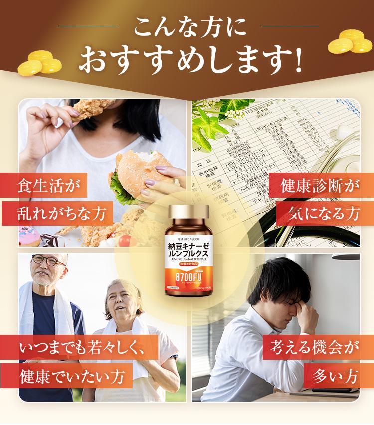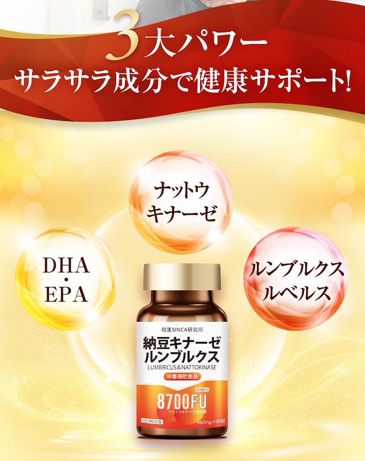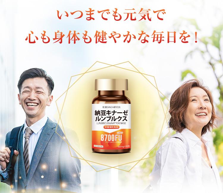 Contains high quality, safe and secure Lumbricus which had gained a patent for production in Japan (Patent No. 5696917)Lumbricus can help dissolve blood clots in blood vessels, and is expected to prevent and ameliorate blood clots, thus preventing myocardial infarctions and strokes