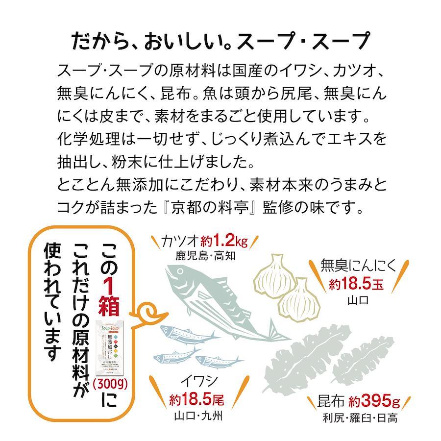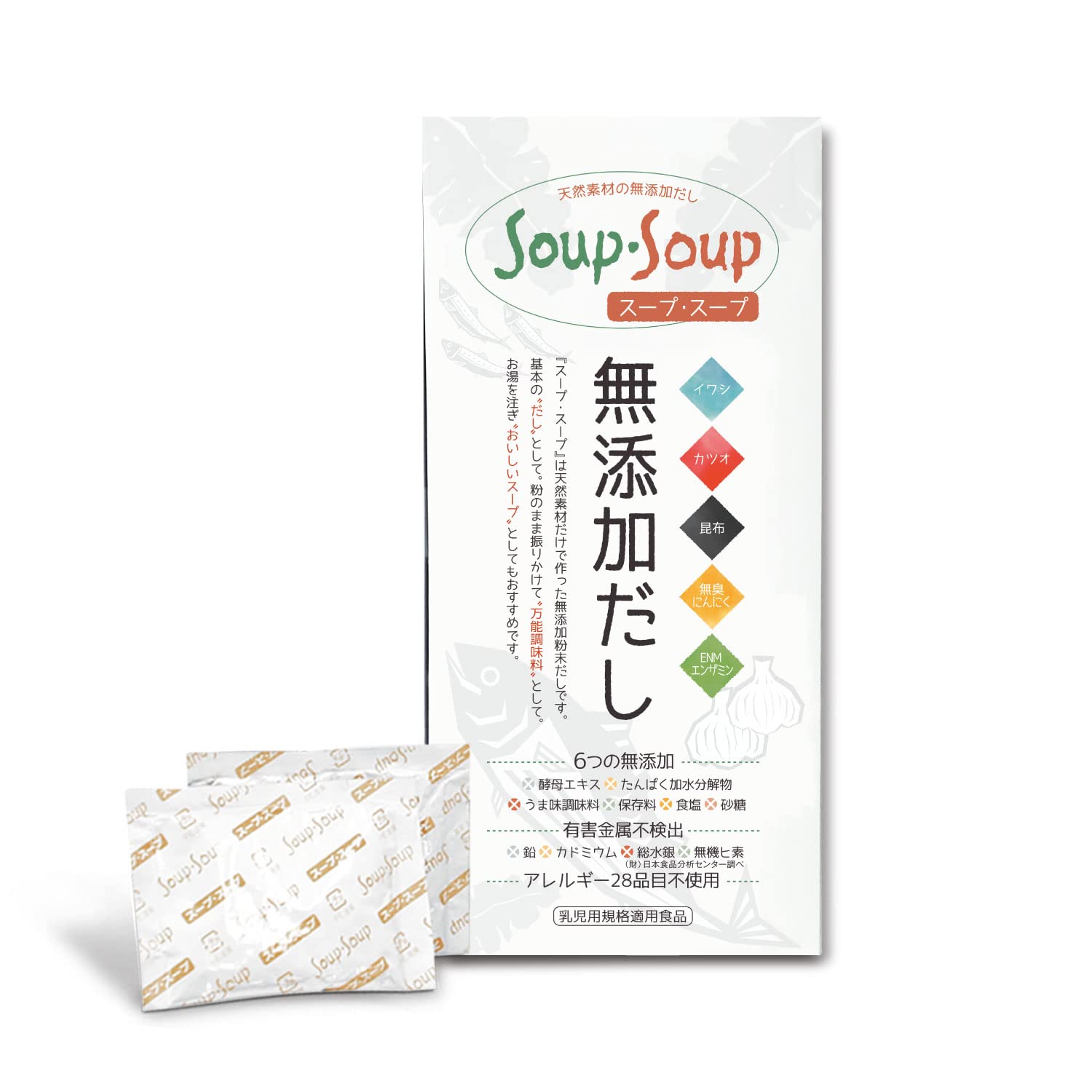 『スープ・スープ』は天然素材だけで作った無添加粉末だしです。基本の“だし”として。粉のまま振りかけて“万能調味料”として。お湯を注ぎ“おいしいスープ”としてもおすすめです。
