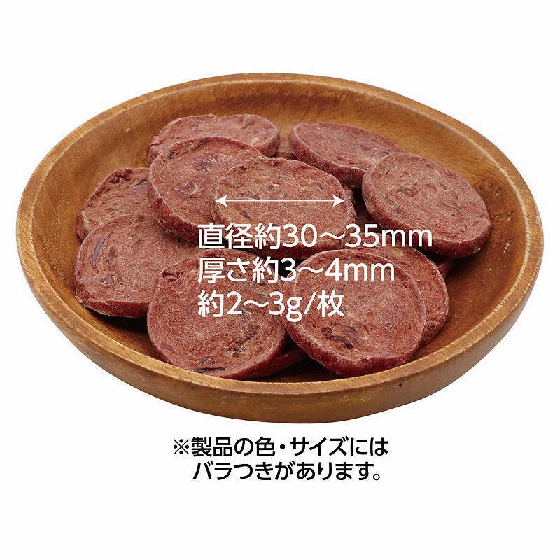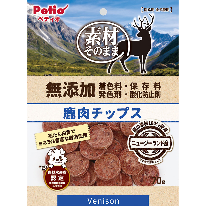 ・高たん白質・ミネラル豊富な鹿肉使用。・肉の旨味がしっかり味わえる。・ほどよい硬さで、ちぎって与えやすいチップス形状。・着色料・保存料・発色剤・酸化防止剤 無添加。・農林水産省認定 偶蹄類加熱処理工場製造。