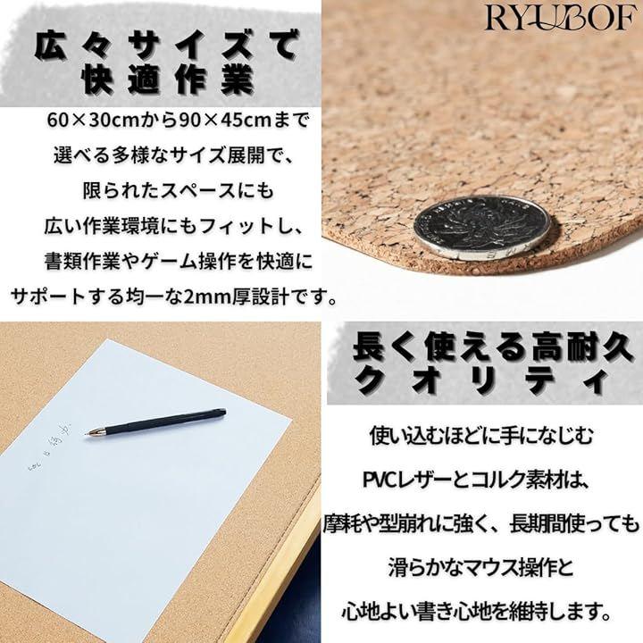 「両面デザインで多彩に使える」持続可能なナチュラルコルク面と高品質PUレザー面を備え、季節や気分で使い分け可能な大型デスクマットは、オフィスや家庭での作業効率を高める機能性と美しさをあわせ持ちます。