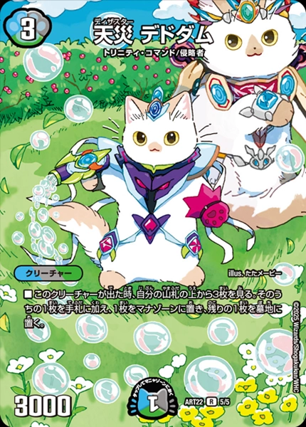 ■搭載パック:ART-22神アートアニマル・マスターズ~決闘は猫である~■収録:特別拡張パック■■レアリティ:レア■種類:クリーチャー■文明:多色■種族:トリニティ・コマンド/侵略者■コスト:3■パワー:3000■マナ:1■■シリーズ:DMART■シリーズ■効果テキスト:■このクリーチャーが出た時、自分の山札の上から3枚を見る。そのうちの1枚を手札に加え、1枚をマナゾーンに置き、残りの1枚を墓地に置く。■フレーバー:‐