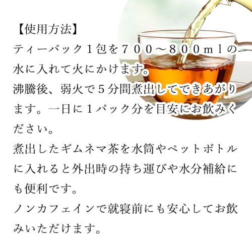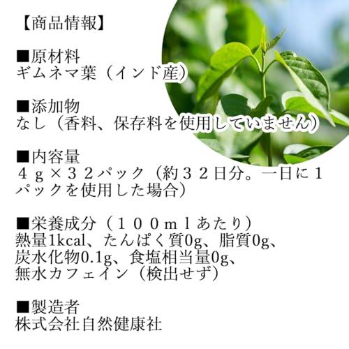 【原材料】ギムネマ葉(インド産) 【無添加】(香料、保存料などを使用していません) 【内容量】4g×32パック(約32日分。一日に1パックを使用した場合) 【ギムネマについて】インドに2000年以上伝わるアーユルヴェーダ(アーユルベーダ)という伝承医学で使用される植物のギムネマシルベスタ。「砂糖を壊すもの」という意味で、その通り甘いもの、炭水化物が好きな方の食の改善やダイエットサポートに役立てられています。 【使い方】無農薬で育ったギムネマの葉を乾燥させ、適切な焙煎を施したギムネマ茶です。ティーパック1包を700~800mlの水に入れ、煮出してお飲みください。ノンカフェインで妊娠中、授乳中も安心です。 【栄養成分(100ml中)】熱量1kcal、たんぱく質0g、脂質0g、炭水化物0.1g、食塩相当量0g、無水カフェイン(検出せず) 無漂白ティーパック使用