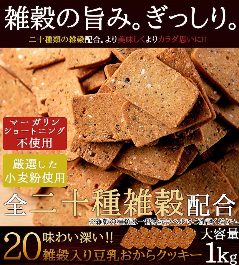 3営業日以内に発送≪新品未開封品≫●人気の豆乳おからクッキーに美容健康に大注目の雑穀が20種類も配合!!栄養価の高いヘルシーおやつ♪●商品名:20雑穀入り豆乳おからクッキー●名称:焼菓子●原材料:小麦粉(小麦(北海道産))、砂糖、雑穀(きび、玄麦、大豆、キヌア、ごま、白麦、ひえ、大麦、玄米、米粉、もち米、黒米、あわ、黒大豆、とうもろこし、白ごま、アマランサス、高きび、発芽玄米、はと麦)、卵、豆乳、サラダ油、おから、アーモンドプードル(アーモンド、コーンスターチ)、コーンスターチ、食塩/トレハロース、クエン酸鉄アンモニウム●内容量:1Kg●賞味期限:製造より常温120日(約40日~120日弱賞味期限が残ったものでのお届けとなります)●保存方法:直射日光、高温多湿を避け常温で保存して下さい。●販売者:株式会社天然生活●〒141-0032 東京都品川区大崎3-6-4 トキワビル7F●※開封後は、賞味期限に関わらずお早めにお召し上がりください。●※本品製造工場ではそば、落花生、乳成分を含む製品を製造しています。●【栄養成分表示】(100g当たり)●エネルギー 464kcal●たんぱく質 13.3g●...
