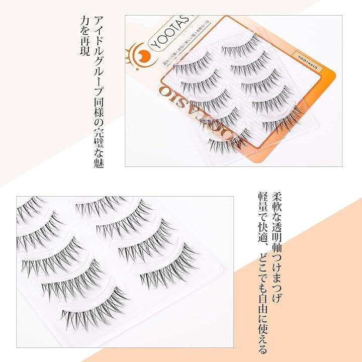 「柔軟な透明軸つけまつげ束感」YOOTASIOこのつけまつげは、アイドルグループのステージメイクからインスパイアされ、繊細な繊維とボリューム感で自然な束感を実現します。