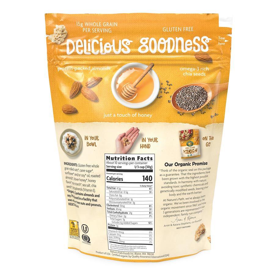 有機押しオート麦、クローバーのオーガニックハチミツ、有機チアシードに有機ローストアーモンドがアクセントを添えている美味しく、クリスピーなオーガニックグラノーラです。グルテンフリー商品。ネイチャーズ パースはアメリカNo.1のオーガニックシリアルブランドです。厳選したオーガニック食材を利用して、健康的で、最高に美味しいオーガニックシリアルやグラノーラを作っています。 ネイチャーズパース社は、人々のより良い生活と地球の美しい姿が守られ、そして継続していくことを常に望んでいます。持続可能な方法で作った美味しく、その上オーガニックで健康的な自社商品が成長し続けているということが、同社の情熱のよりどころです。このような思いがファミリーカンパニーであるネイチャーズパース社の会社の基礎理念となっております。