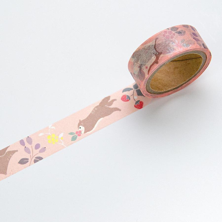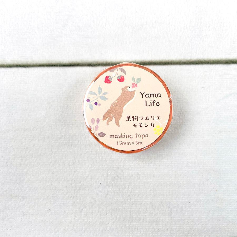 山に住む動物たちの暮らしを楽しく描いたマスキングテープです。山の中を自由に飛び回り、果物を集めるモモンガの様子をデザインしました。本体は和紙に印刷した後に糊引きを施す製作方法を採用しており、上質な仕上がりとなっております。