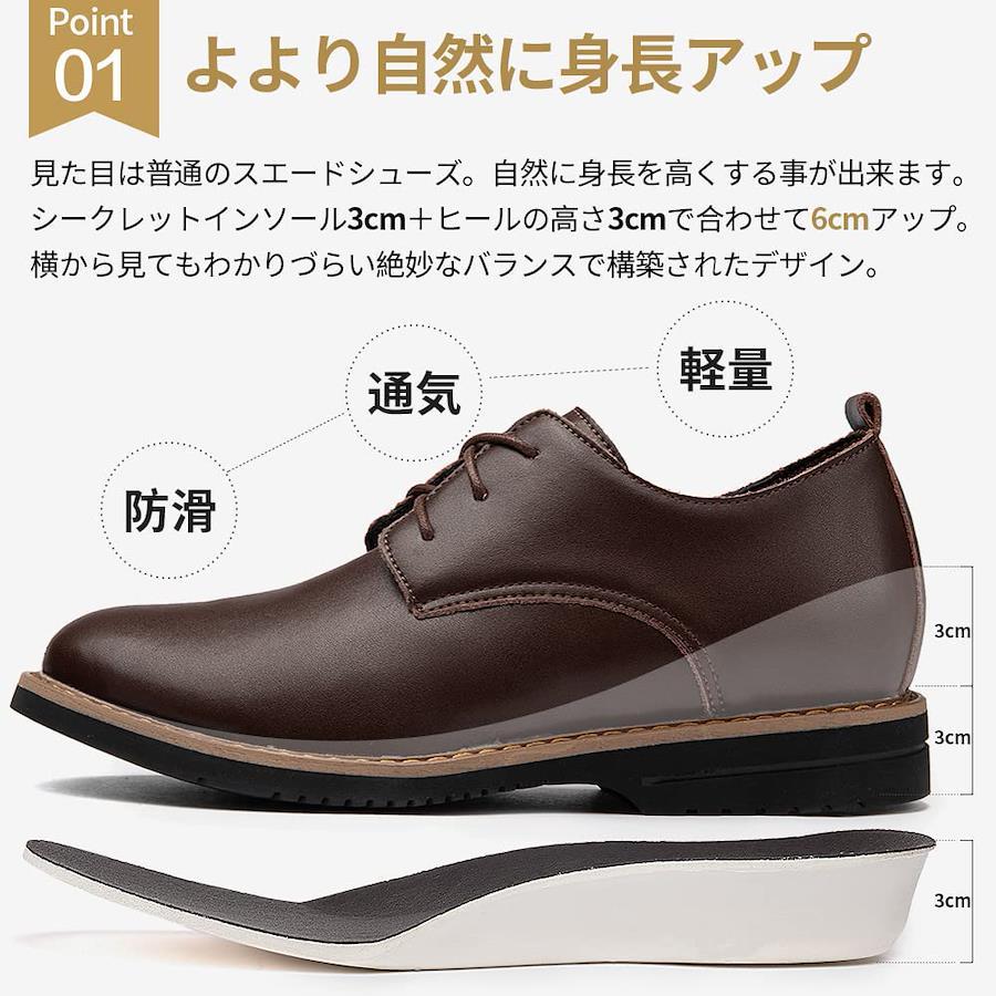 クロージャータイプ レースアップ 【ロングセラー当店で最も長く愛されているシークレットシューズ】発売当初より人気のシークレットスニーカーです。シンプルで使い勝手の良い定番デザインと。軽やかでゆったりとした履き心地が人気の秘訣。ビジネスシューズではあるものの、モードファッションに合わせて普段使いもできそう。【6cm身長が高くなる靴!外見からは気づかれない自然なデザイン】 見た目は普通のスエードシューズ。かかと部分が目立たず、くるぶしの位置もごく自然。シークレット感はまったくありません。この見た目で6cmアップは優秀です。自然に身長を高くする事が出来ます、好印象になります。【人体工学的に設計されたカップ形状インソール使用】全てのヒールインソールは取外し可能でクリーニングも簡単!ポリウレタン(PU)素材なので長時間の使用でも変形されず、優れた弾力性が足の疲れを軽減してくれます。中敷きが傾斜となっている為、自然と背筋が伸び姿勢を正す事が出来ます。【選り抜いた上質な牛革、シンプルデザインスエードシューズ】合成皮革と比べると、天然の牛革には風通しが良い、柔らかくて肌に優しいなどメリットが挙げられます。その上、牛革が擦りかけても捻じ曲げても容易に壊れないから、丈夫さと耐久性を持ち合わせています。生地が伸び縮みするため、誰が履いてもスタイリッシュなおしゃれ感のあるシルエットに仕上がっています。シンプルかつ上品!どんな着こなしにもマッチし足元からシャレ感を作る。【脚長効果だけじゃない!スッキリ細見え美脚効果】女性のハイヒール同様、踵の上がった厚底のもたらす効果は美脚にも繋がります!背伸びをしたような状態をキープすることで足首が細くなり、ふくらはぎや太ももの筋肉は収縮しスッキリして見えます。脚長効果でシンプルなファッションも着こなせる様になります。