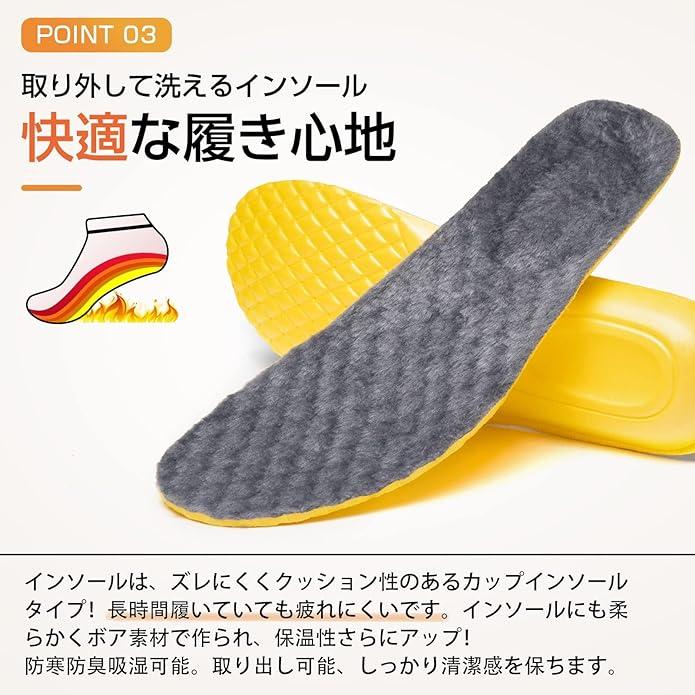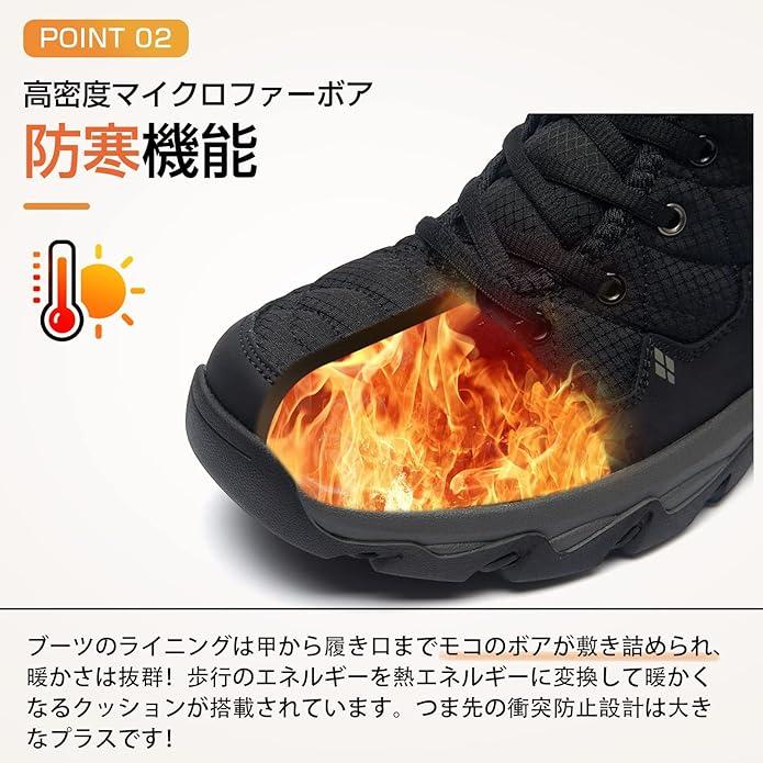 4.日本人の足には最適◎気楽に履けるラウンドトゥデザイン!★3E。幅広でゆったりめのラウンドトゥが、十分な足空間を与える。甲が高い方や幅広い方でも楽々に手入れできます。暖かくて、さらにスマートで、かっこよくも見えます! ★がっちりとしたアッパーデザインで、つま先保護できる、怪我を防ぐ。ウォーキング、旅行、トレッキング、登山など様々なアウトドア活動には相応しい。★ミドル丈で使い勝手が良く、通学・通勤・お出かけ・アウトドア等々、寒い季節でシーンを選ばず活躍する1足です。
