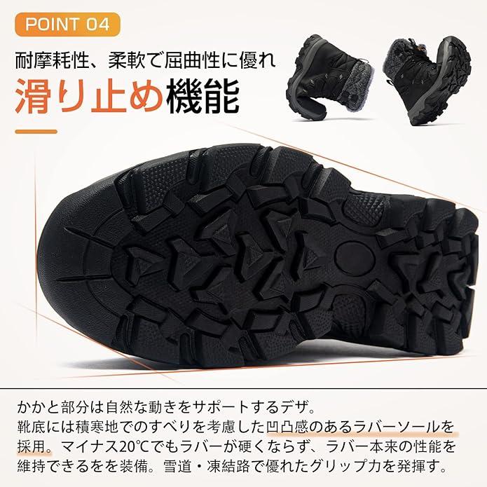 3.滑りにくさ! 雪や氷など濡れた道でも滑りにくい、優れたグリップ力が自慢の独自ソールを採用。ソールの形は、凹凸があり溝が深いものだとより安定感があります。アウトドアはもちろん、路面凍結が心配な寒冷地のストリートシーンにも活躍するウィンターブーツです。雪道や凍って滑りやすい路面での歩行をサポートする「スノーブーツ」。冬期のアクティビティを楽しむ際はもちろん、日常生活においても快適な履き心地を実現します。