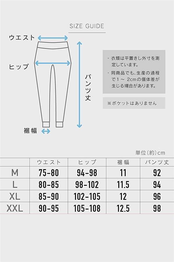 「Mサイズ」パンツ丈 92cm / ウエスト 75~80cm / ヒップ94~98cm / 裾幅 11cm 「Lサイズ」パンツ丈 94cm / ウエスト 80~85cm / ヒップ 98~104cm / 裾幅 11cm 「XLサイズ」パンツ丈 96cm / ウエスト 85~90cm / ヒップ 102~105cm / 裾幅 11cm 「XXLサイズ」パンツ丈 98cm / ウエスト 90~95cm / ヒップ 105~108cm / 裾幅 12.5cm