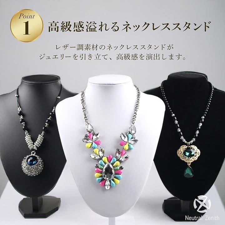 「高級感溢れるネックレススタンド」ベルベットとレザー調素材のネックレススタンドは、高級感を演出し、ジュエリーを魅力的に引き立てます。