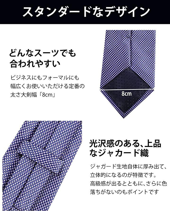 「セット内容」ネクタイ(長さ145cmx大剣先幅8cm)、ポケットチーフ(25x25cm)、タイピン、カフスボタン2つ、5点セットです。