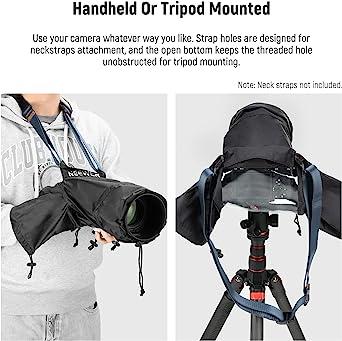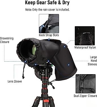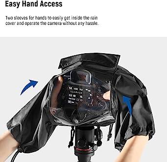 【簡単なアクセス】レインカバーの内側に簡単に入る2つのスリーブで、カメラを簡単に操作できます。カメラストラップは、ストラップホールを通してレインカバーに接続でき、手持ちカメラ撮影を容易にします。