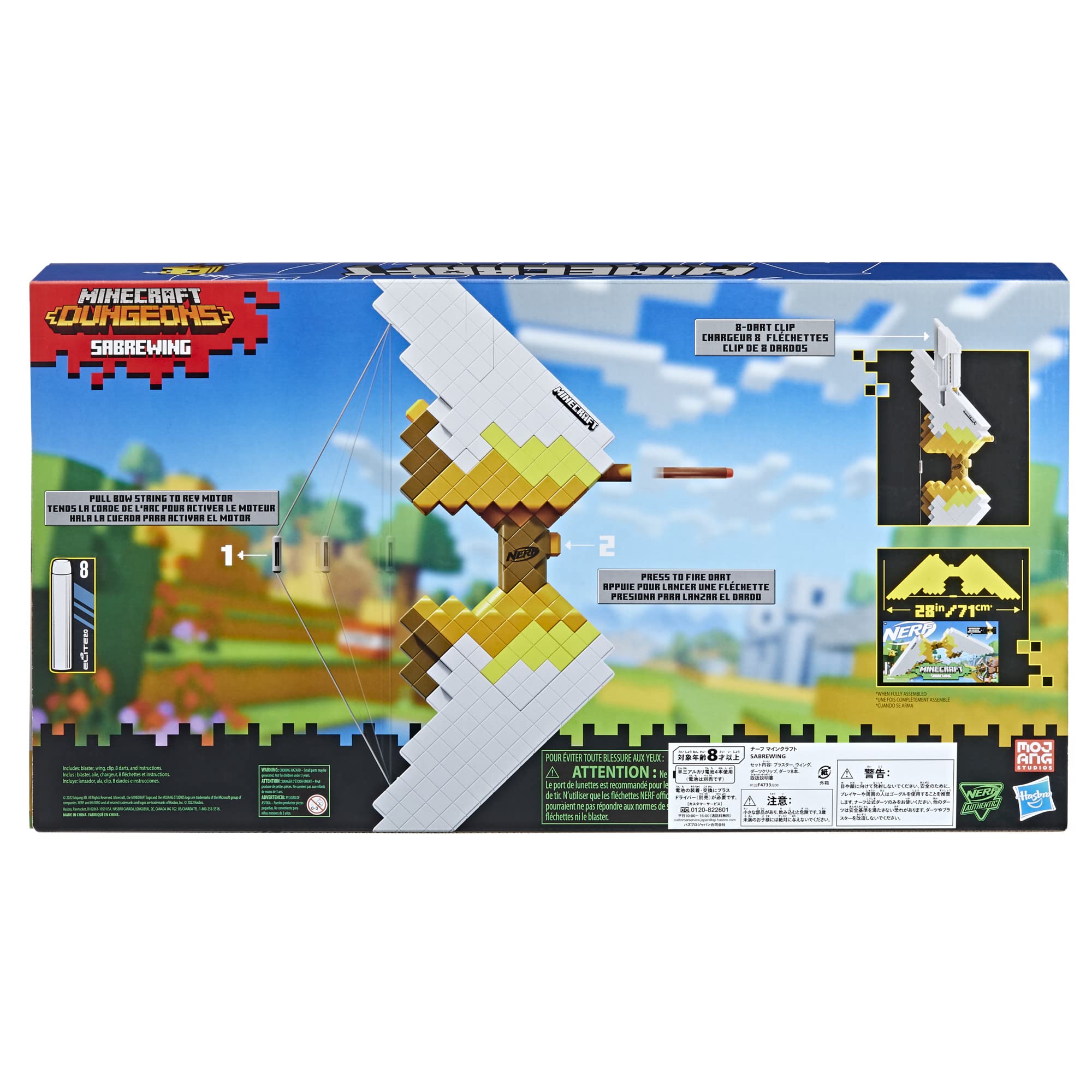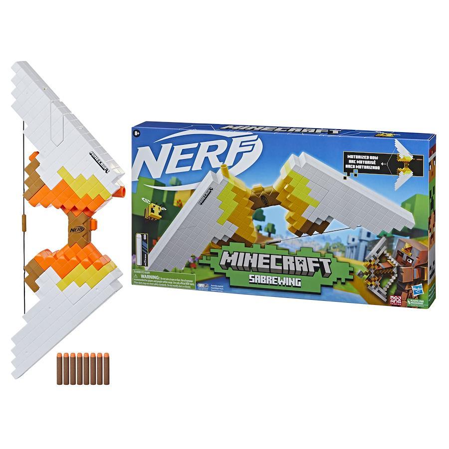 【ナーフ マインクラフト SABREWING 弓型ブラスター】ナーフ マインクラフトの電動弓型ブラスターは、マインクラフトに登場する弓をモチーフにしたデザインです。【電動でダーツを発射】電動で8本のダーツを連続で発射してパワフルに攻撃しよう!単三アルカリ電池4本使用 (別売)。【ダーツ8本付き】ナーフ マインクラフト Sabrewing ブラスターには、ナーフ公式エリート ダーツ8本が付属しています。屋内外問わずすべてのゲームでお楽しみいただけます。【ダーツ8本を格納できるダーツクリップ付き】ダーツ8本を装填できるダーツクリップが付属しているので、再装填までに8本のダーツを連続で発射できます!【リアルな弓のアクション】弦を一番後ろまで引くと、リアルな弓のアクションを楽しめます!狙いを定めてダーツを発射してバトルで勝利しよう!