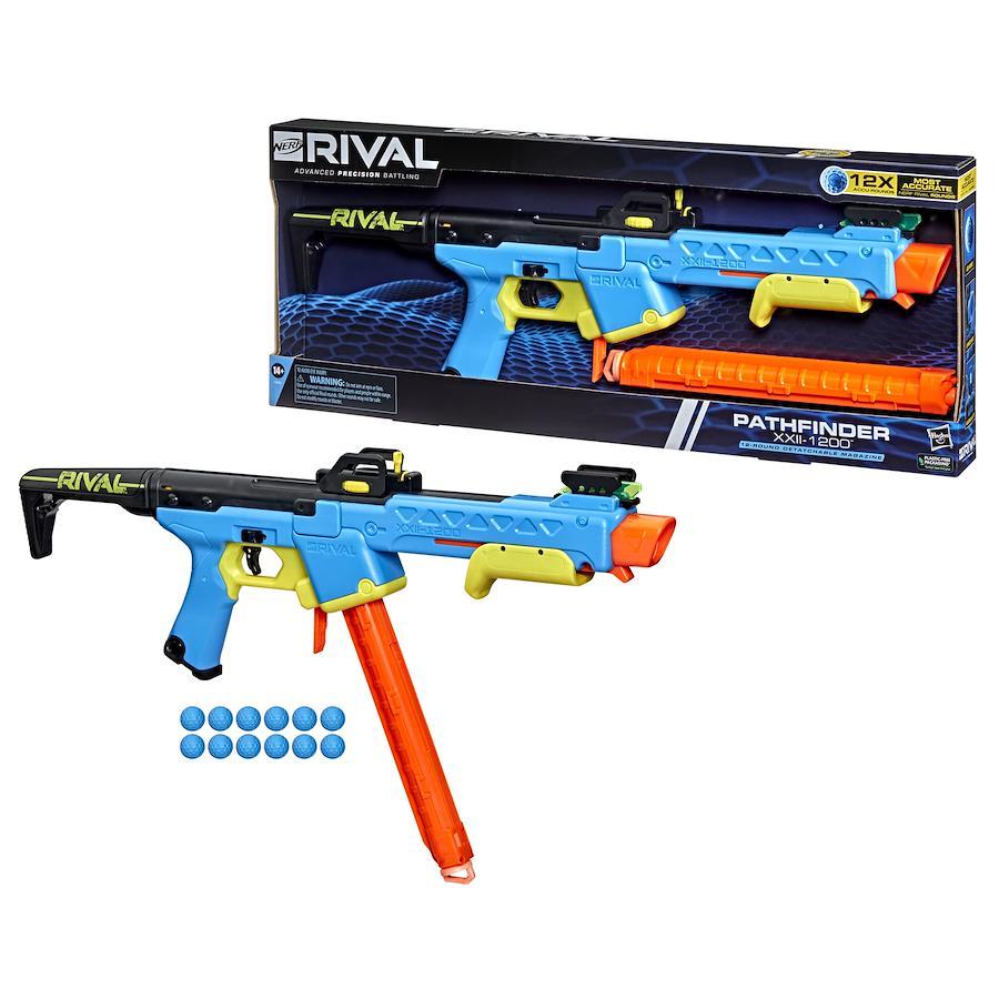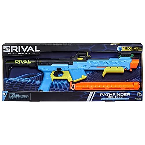 NERF RIVAL Pathfinder XXII-1200 Blaster, the most accurate Rival system, with an adjustable sight, a 12-round magazine, and 12 Rival AccuRounds.