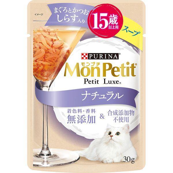 ネスレ 4902201213257 モンプチ プチリュクス ナチュラル スープ 15歳以上用 まぐろとかつお しらす入り 30g着色料・香料無添加&合成添加物不使用着色料・香料無添加、合成添加物も不使用のナチュラルパウチ。15歳にやさしい小さめやわらかフレーク。●商品管理番号:4902201213257●生産地:タイ●サイズ:商品サイズ:W80×H115×D10(mm)商品重量:35.5g●素材:<原材料>魚介類(かつお、まぐろ、しらす、フィッシュエキス)、フィッシュオイル、増粘多糖類、ビタミンE<保証成分>たんぱく質9%以上、脂質0.2%以上、粗繊維1%以下、灰分3%以下、水分94%以下エネルギー:40kcal/100g●内容量:30g●賞味期限:24ヶ月●メーカー名:ネスレ日本 株式会社 ネスレピュリナペットケア