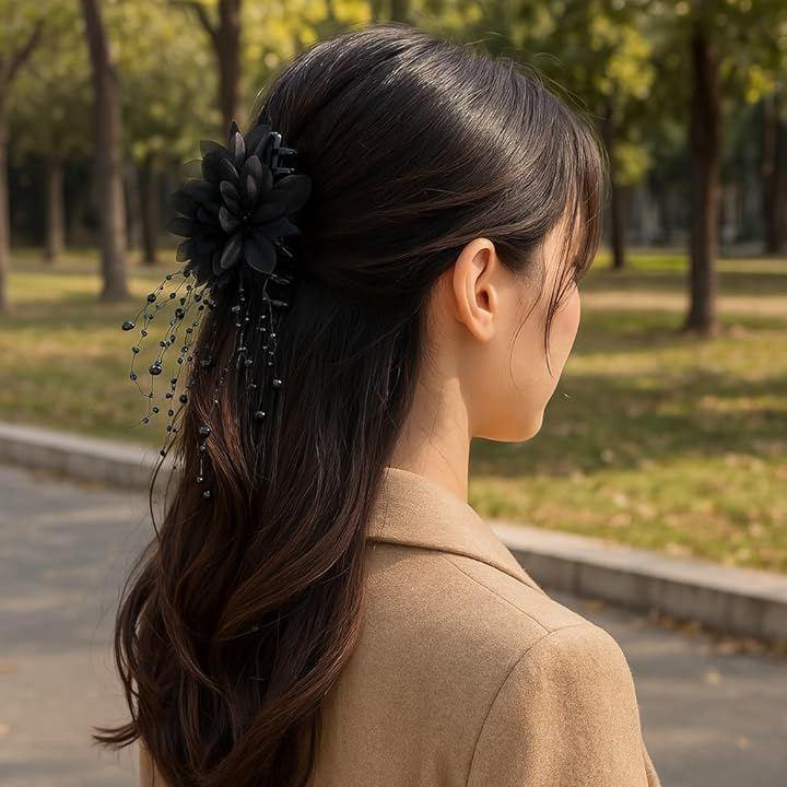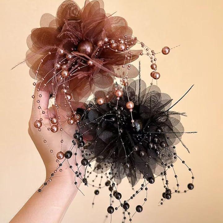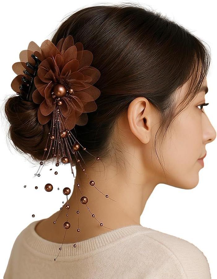立体的なフラワーデザインとパールの揺れが、後ろ姿まで華やかに演出。