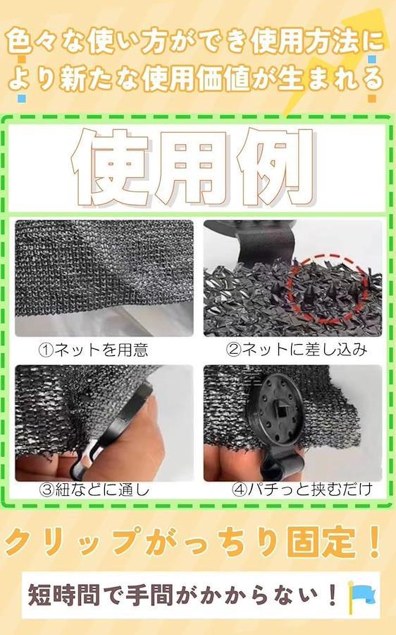 遮光黒寒冷紗ネット・防鳥ネット・防虫ネット・防獣ネット・防風ネット・日除けサンシェードネット・家庭菜園ネット・園芸ネット・菜園ネット・農業ネット・遮光ネットなど色々な用途に応じた固定留め具としてお使いいただけます。