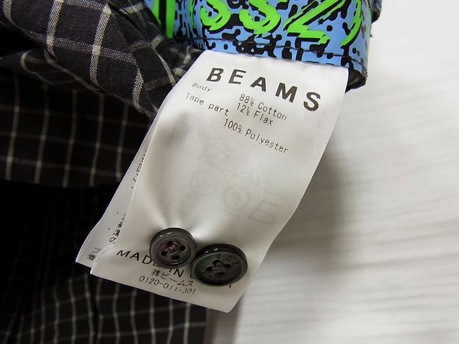 ●(株)ビームスの正規品コットンリネン混紡のオーバーサイズチェックシャツ。胸ポケットに存在感を放つ大きなピスネームタグ、両袖やサイドにカットデザインが入り、ブランドロゴテープがデザインされています。