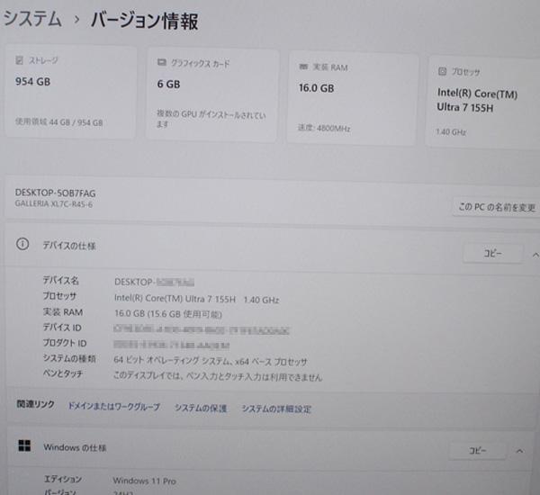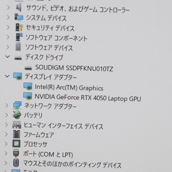 OS Windows 11 Pro 64bitCPU Core Ultra 7 155H 1.40GHzグラフィックス GeForce RTX 4050 Laptop GPUメモリ 16GBメモリストレージ 1TBディスプレイ 15.6インチ液晶 (2560×1600)