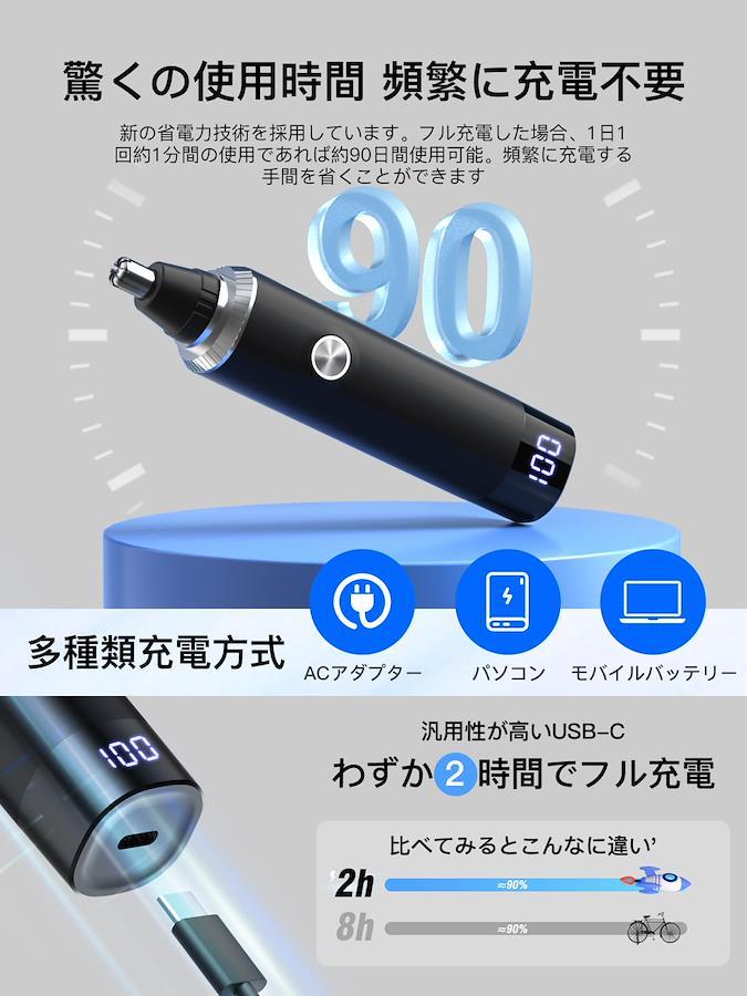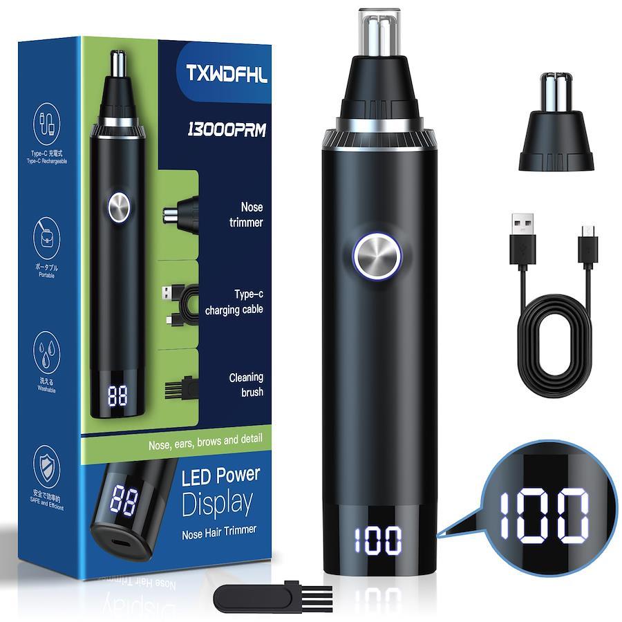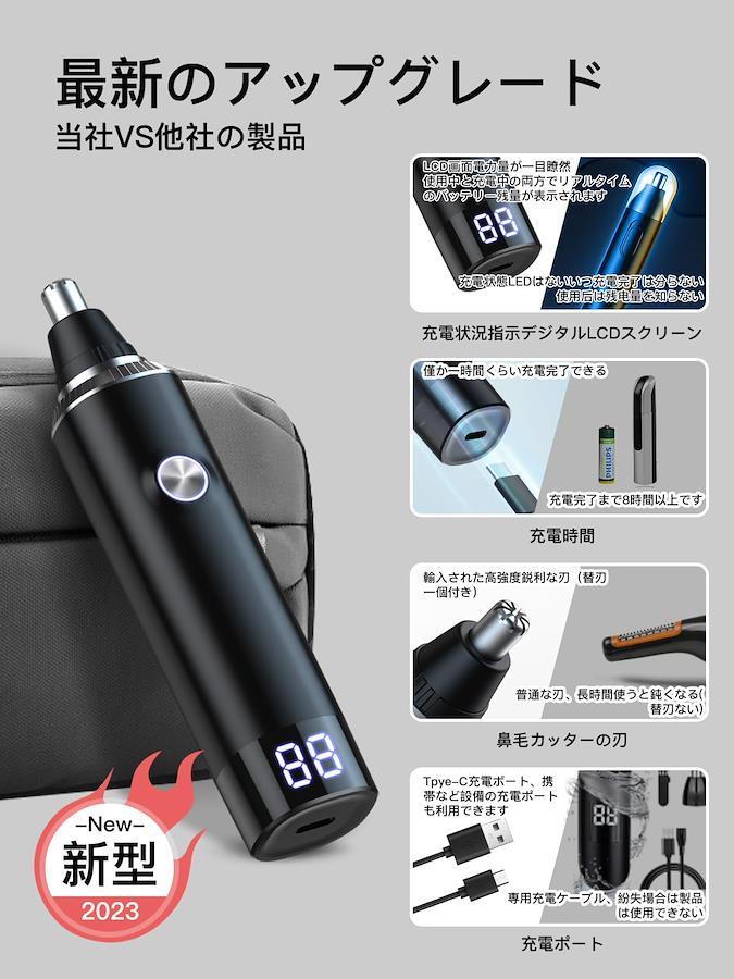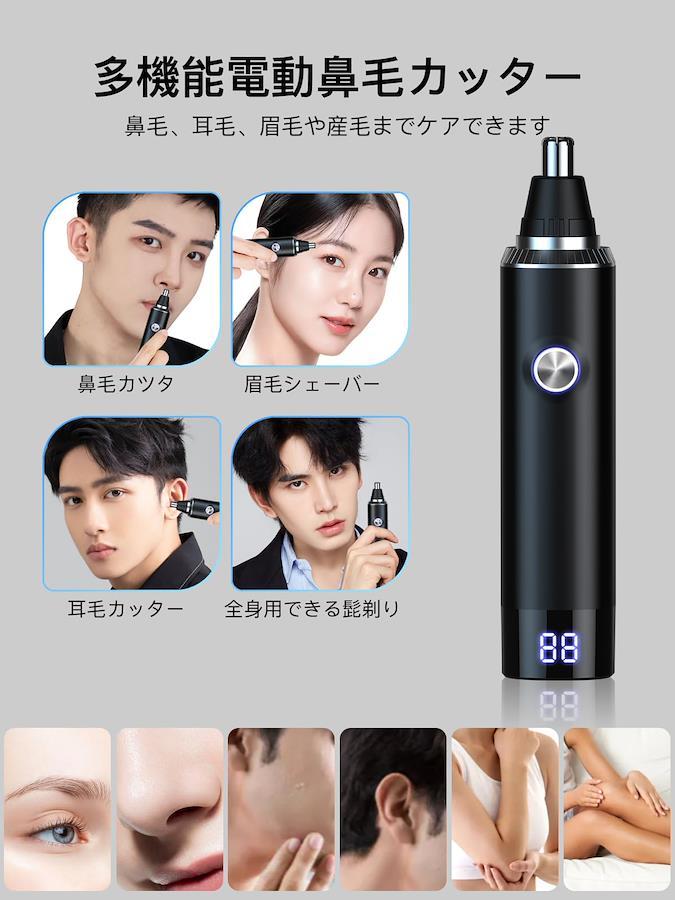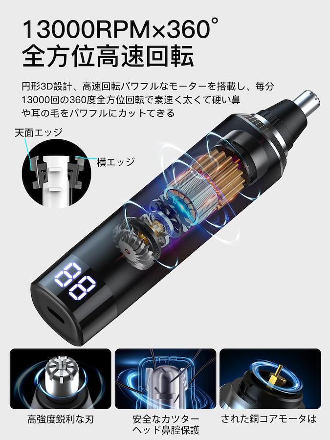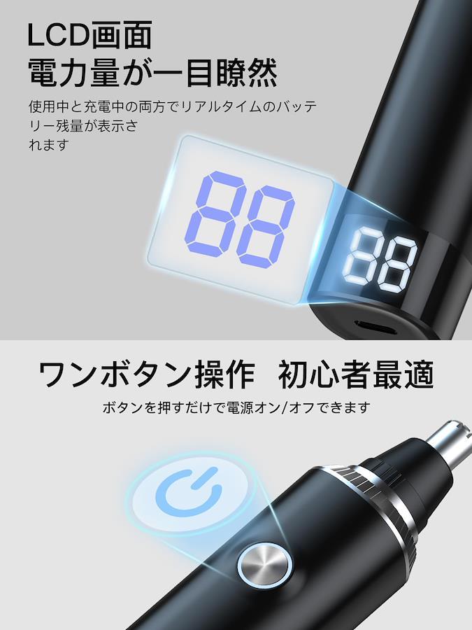 【多機能電動鼻毛カッター&肌に優しくて安心&&防塵カバー】電動鼻毛カッターに1つのカッターヘッドを搭載し、反時計回りに少しひねって緩めて外せて、簡単に交換できます。鼻毛だけでなく、耳毛もケアできる多機能なエチケットカッターです。しかも防塵カバーを搭載し、ごみがヘッド内部へ入らないように防止します。同時に、ヘッド部分が圧迫されて衝突すること、ショックを防止し、より良い保護の役割を果たします。360度回転するダブルロータリーブレードを採用。鼻毛を引っ張らないようにしながら、どの方向の鼻毛もかんたんに処理できる安全仕様です。眉毛 鼻毛シェーバー メンズ人間工学に基づいた3Dデザインのトリマーは、安全性を考慮したダブルブレードを内蔵し、鼻腔に密着して鼻毛を素早くトリミングします。鼻毛カッター メンズご使用後は内部までかんたんきれいに洗うことが可能です。 【LCD画面 & Type-C急速充電・驚きの使用時間】デジタルLCDスクリーンを搭載したので、いつでも電力残量を把握することができ、途中で停電する心配がなく、使用体験をアップします。USB充電ポートの独自の設計を使い、過電圧、過充電、短絡を防止し、安全性を向上させる同時に、充電速度を大幅に向上し、満タン充電はわずか2時間です。鼻毛カッター パワフルでありながら消費電力が少なく、1度充電すれば最大3ヶ月間の鼻毛切りが行えるため、出張や旅行の移動用としてバッテリー持ちが良く長時間使えます。 【高速静音モーター・360°両回転両刃】鼻毛カッターは全銅DC、トップレベルの高トルクブラシレスマイクロモーターを採用し、カーボンブラシの摩擦音を効果的に低減し、損失を大幅に減す同時に耐用年数を改善し、更に13,000 rpmでスムーズに動作することもできます。精密な360°両回転両刃ステンレス刃を搭載し、太くて硬い鼻毛や耳毛も楽にカットできます。刃は人間工学に基づいた 3D デザインを使い、保護キャップ付き、刃の円形形が 360 度のスリットから入る鼻毛を捉えます。電動鼻毛カッター鼻腔にしっかりとフィットし、鼻毛を引っ張らなく、鼻の内部を傷つけなく、更に抗アレルギー、もっと安全で快適に使用できます。鼻毛カッター メンズコンパクトデザインにもかかわらず、強力なカットを確保しながら回転音を最小限に抑えます。低騒音設計なので、静かな環境で使用しても、他人に迷惑をかけることはありません。 【素敵な外観 / ワンボタンで簡単操作・押すだけで即回転】従来の鼻毛カッターのスイッチは底面に設置されており、使用には不便なものが多いです。弊社の多機能鼻毛カッターは業界最新デザインとしてのスイッチが本体の中央に搭載されています。ボタンを押すだけで電源オンになり、片手でも把握で きるシンプル操作だから初めての方でも簡単に使いこなせます。【上品なアルミ合金製・極上の触り心地】鼻毛カッター 充電式の本体は高級感のあるアルミニウム合金素材に改良し、優れた放熱性を持つ、質感もアップしました。さらに鼻毛カッター メンズのカッターヘッドが高品質な断熱材を採用し、長時間使用しても発熱しにくく、安全安心かつ快適なカット体験が可能。 【IPX7防水&刃外せます】電動鼻毛カッターはIPX7防水仕様で、安心して水洗いができます(充電ポート除く)。ヘッド内部の刃も取り外して、付属のブラシで掃除できるので、カスや雑菌の繁殖を防止することができ、いつも清潔に保つことができます(本体は水洗いできますが、水に浸さないでください) 【万全なアフターサポート・1年間の製品保証】同梱物:鼻毛カッター本体、カッターヘッド×1、防塵キャップ、お掃除ブラシ、Type-C充電ケーブル、取扱説明書。弊社は「お客様からの信頼」を大切にします。お客様のお役に立ち、信頼される会社であり続けられるよう。ご購入日より12ヶ月の保証を提供いたします。万一、エチケットカッターに破損、汚れ、キズ、不良等がございましたら、無償で返品・返金・交換させていただきますので、ご連絡ください。 開封済み、使用済みのはな毛カッター 男性でも構いません。最善なアフタサポートが全力で!