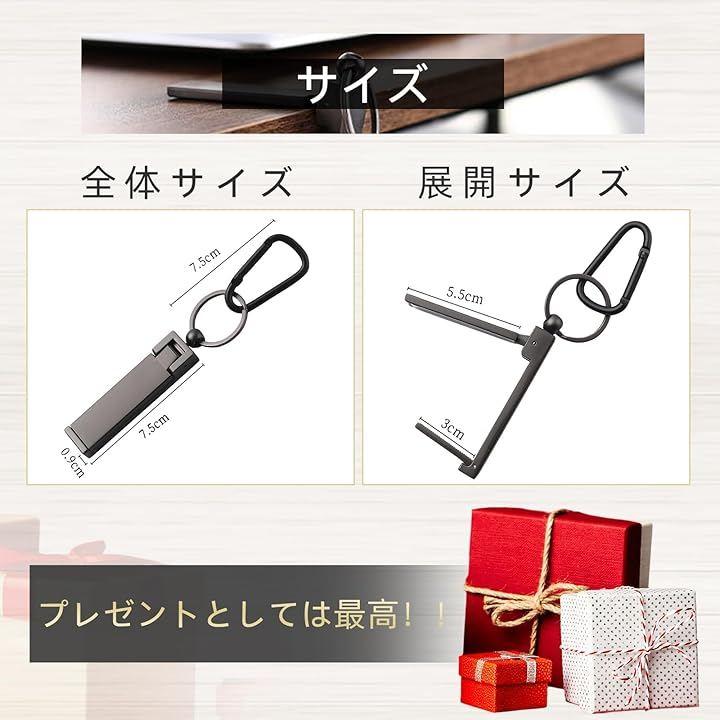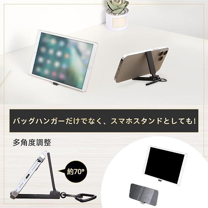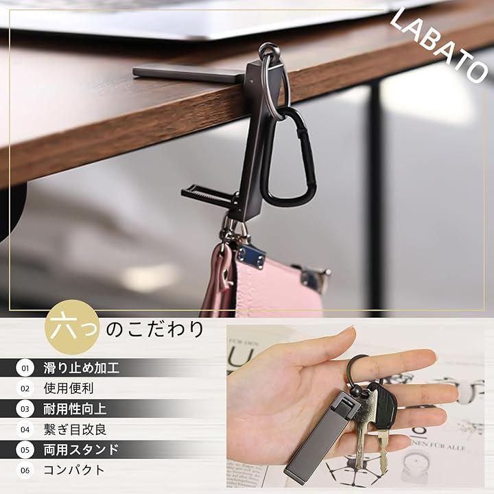 本製品は多機能タイプで、バッグハンガーとして使うだけでなく、スマホスタンドやキーホルダーとしても活躍します。